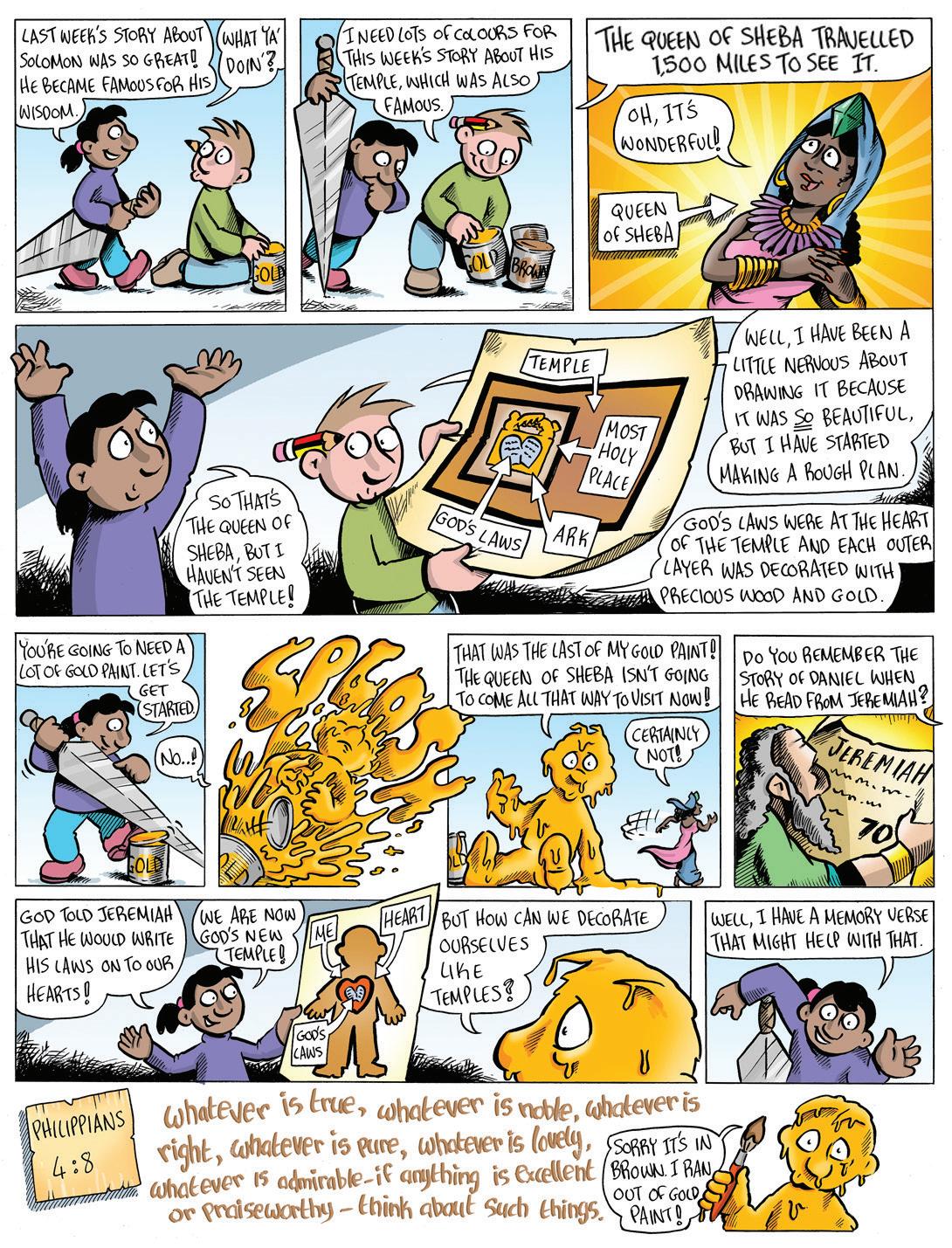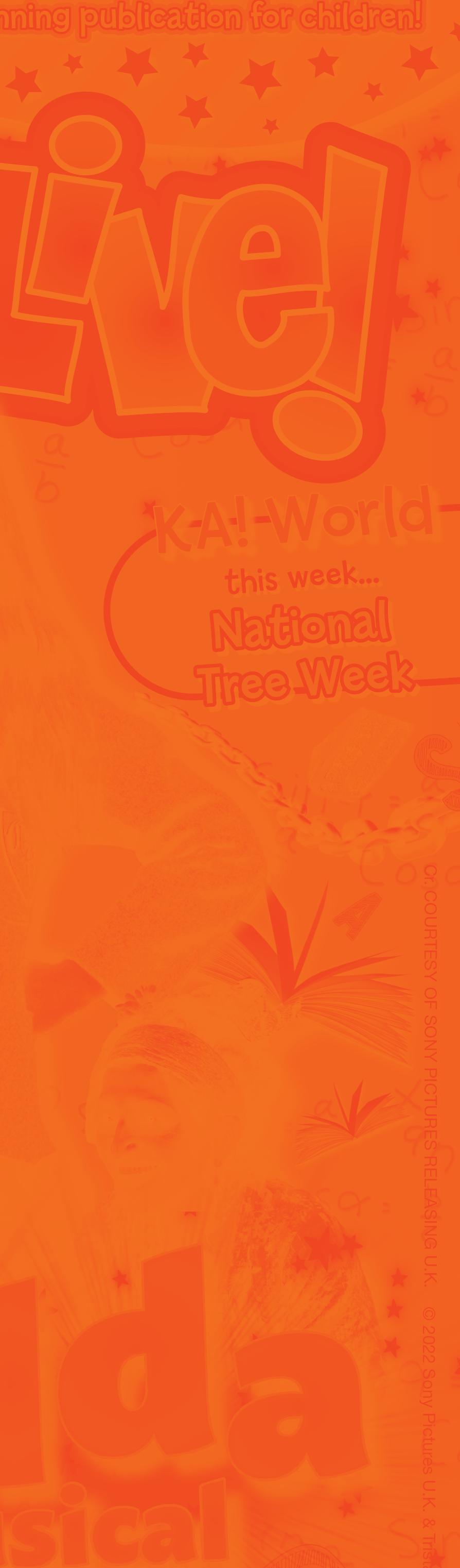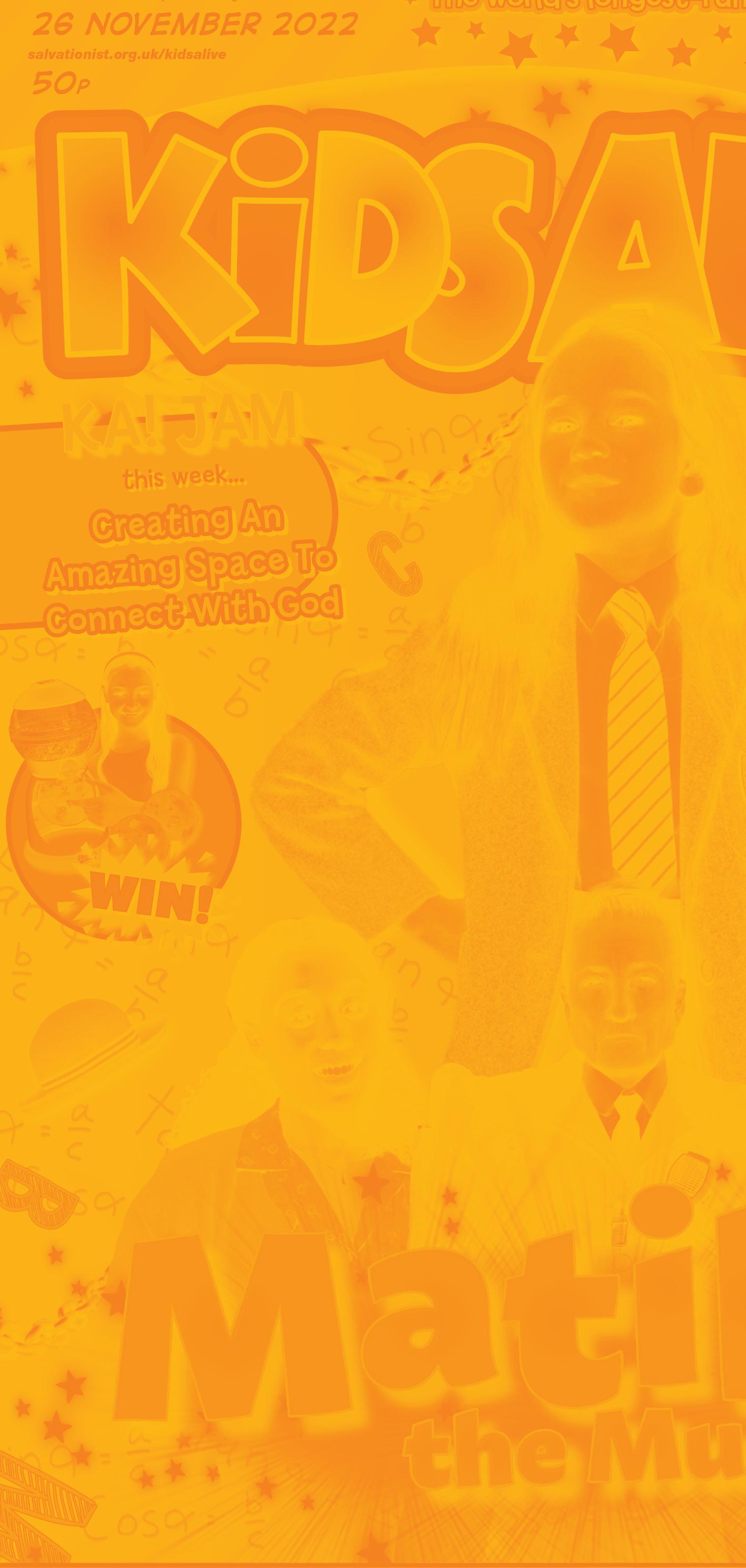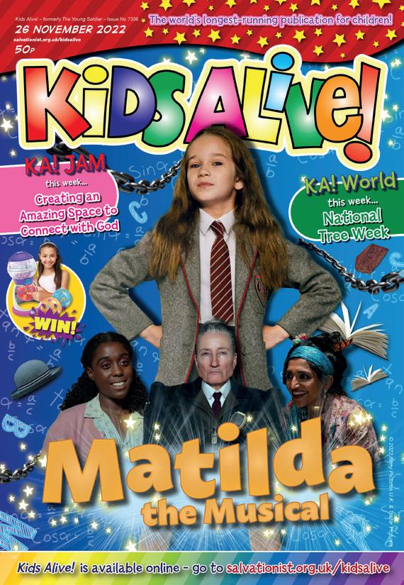the answers Hey there, readers! We hope you’ve enjoyed reading this issue of Kids Alive! If you would like to get your own copy of Kids Alive! delivered to your home every week, why not ask your parents or guardians to take out a subscription* for you? Every week, Kids Alive! includes a cartoon Bible story, a competition, puzzles, jokes, comic strips and topical activities and articles for you to enjoy. Ask your parents or guardians to go to sps-shop.com/kids-alive, call 01933 445445 (option 1, option 1) or email subscriptions@satcol.org to set up a subscription. Subscribe* to A subscription* costs just £4.33 a month (or a one-off payment of £52) – all that fun for less money than the price of two chocolate bars a week (and healthier too!). And this way, you get a gift that lasts all year long! *This subscription offer applies in the UK and Republic of Ireland, with 51 copies delivered over 12 months. Please note that different prices apply to Europe and international orders. Available online! for £4.33 a month TheyServedtoo wewillrememberthem thinkingofcivilianvolunteersandemergencyservicepersonnelKidsAlive! isavailableonline–gotosalvationist.org.uk/kidsalive EDITOR Justin Reeves DEPUTY EDITOR Cara Mott GRAPHIC DESIGNER Philippa Martin EDITORIAL ASSISTANT Melita Day-Lewis KA! JAM CO-ORDINATOR Ibukun Baku PROOFREADER Chris Horne Kids Alive! of ce: 020 7367 4910 Email: kidsalive@salvationarmy.org.uk 101 Newington Causeway. London SE1 6BN. Switchboard: 0845 634 0101Published by The Salvation Army United Kingdom and Ireland Territory (cost in the Republic of Ireland: 65c). Founder: William Booth General: Brian Peddle Territorial Commander: Commissioner Anthony Cotterill Editor-in-Chief: Major Mal Davies The Salvation Army is a Christian church and registered charity. The charity number in England, Wales and Northern Ireland is 214779, in Scotland SC009359 and in the Republic of Ireland CHY6399 ISSN 1363-5662 Delivered to your door KA! JAM PICTURE PUZZLE 1 Right. 2 Temple. 3 Sheba. 4 Pure. 5 Paint. New word: Heart. PICK OUT PATCH: Page 11. FESTIVE FUN: Arnold Christmas. The correct title is Arthur Christmas GIGGLE IN THE MIDDLE BULL’S EYE 1 Knife. 2 Eerie. 3 Tribe. 4 Theme. 5 Litre. 6 Evade. New word: Kettle. BIG MYSTERY: Books. CROSSWORD ACROSS: 1 Mass. 3 Chat. 7 Rinse. 8 Mug. 9 Century. 13 Pig. 14 Simon. 16 Tree. 17 Boot. DOWN: 1 Mars. 2 Son. 4 Homer. 5 Toga. 6 Dentist. 10 Eagle. 11 Spot. 12 Knot. 15 Moo. 4–5 KA! JAM 6 Advent Re ections 7 Festive Fun 8–9 Giggle in the Middle 10 The Squeeze Ball Creator Competition Competition 11 Christmas Card Competition 12–13 KA! World 14–15 Your Space 16 Patch’s Pals: Eric the Electric Eel The world's longest-running publication for children! Kids Alive! is available online – go to salvationist.org.uk/kidsalive thisweek... WhatWouldYouSay? MakingWiseChoices Like Solomon this week...well-being. Worl Children © 2022 Disney. All Rights Reserved.