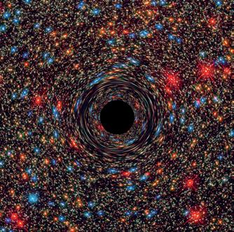 Black holes don’t re ect starlight, they swallow it. Any matter that gets too close to a black hole gets swallowed up as well. Some black holes are known as ‘million-big-star’ black holes. They can contain as much matter as one million to 100 million suns! Astronomers think that these supermassive black holes are at the centre of galaxies.