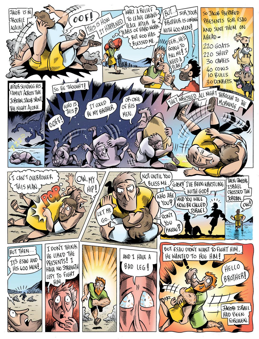 In this week’s cartoon Jacob is heading back to Esau and he’s scared. I would be too! Jacob even sends a message and gifts ahead of him to try to get in Esau’s good books.