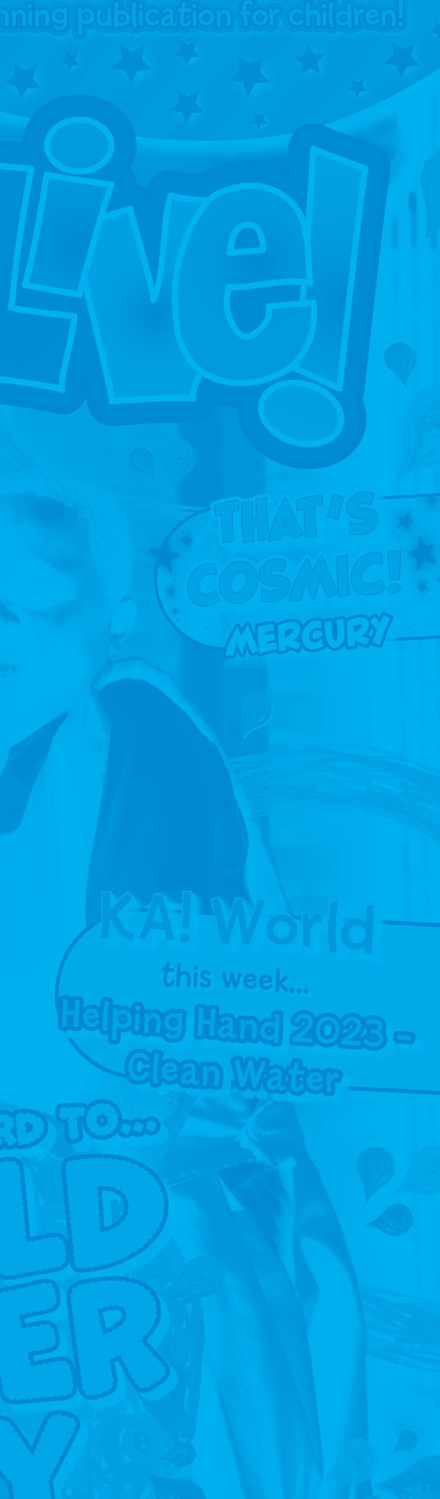 Do you like the photo on this week’s cover? It’s a photo of Mary and Memory who are students in Malawi. You can read about Mary and The Salvation Army’s Helping-Hand Appeal in KA! World on pages 12 and 13. The Helping-Hand Appeal this year is focusing on the importance of everyone having access to clean water. And that’s the same aim as World Water Day, which is happening on 22 March. Billions of people and loads of schools, businesses, healthcare centres, farms and factories around the world don’t have the safe water and toilets that they need.
