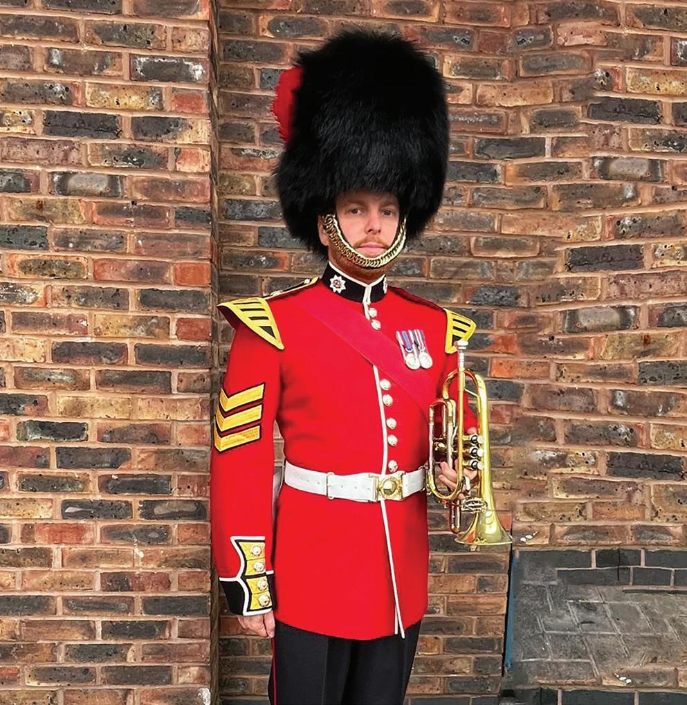 My name is Nick, I’m 36 years old and I’m a trumpet player in the Coldstream Guards Band. Being an Army musician is fun. We are involved in lots of state ceremonial events, including Changing of the Guard at Buckingham Palace, Trooping the Colour (which celebrates the monarch’s birthday) and the National Service of Remembrance at the Cenotaph in Whitehall, London. In my spare time I enjoy spending time with my wife and two young daughters. I also like going to the gym and supporting the best team in the world – Chelsea! Every day as an Army musician is different, but I get to do the thing I love most, which is playing the trumpet. Everyone in the band also has an admin role, and I’m in charge of clothing for the band. This means that I organise tailoring for uniforms and make sure everyone has what they need.