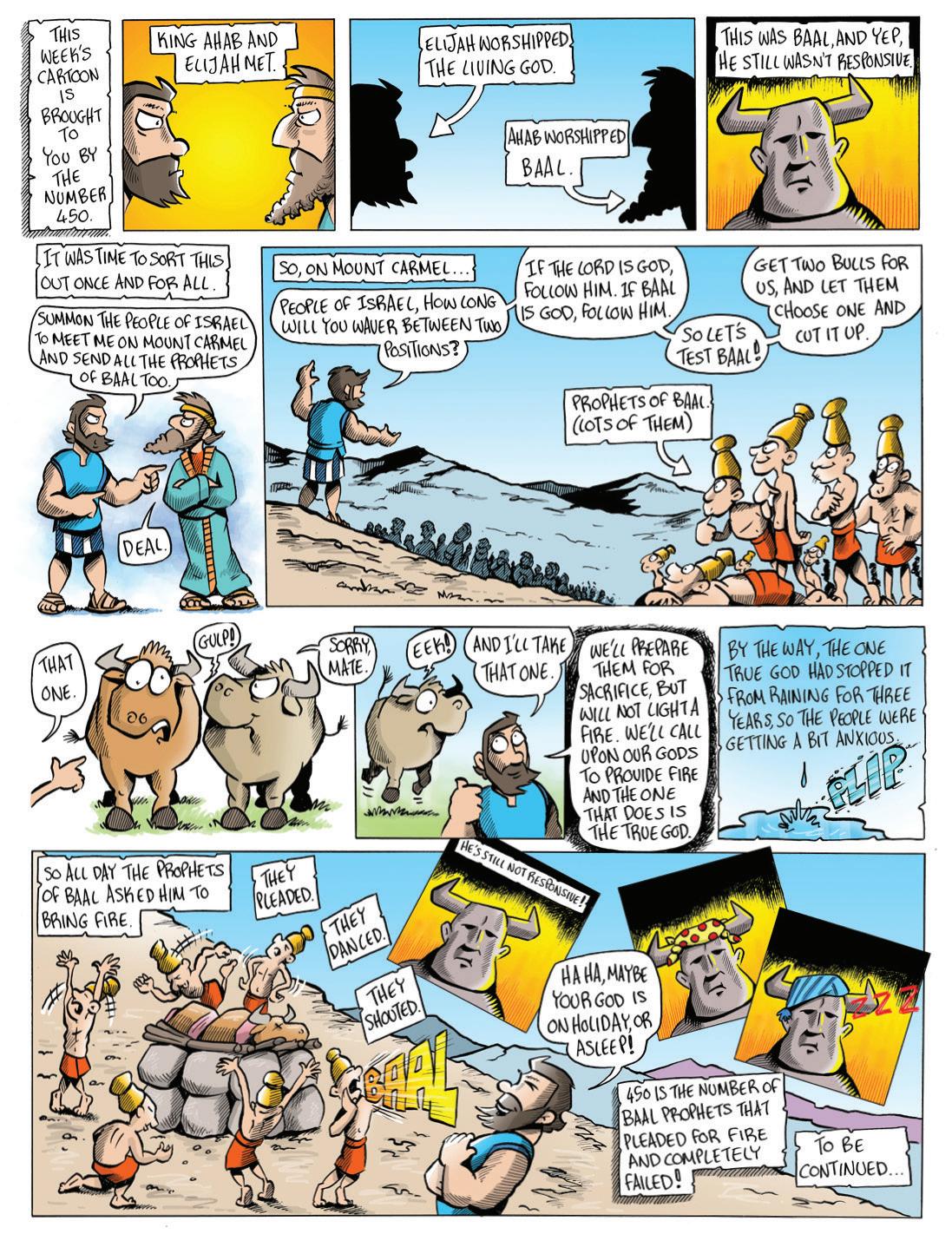 Elijah was just one man facing 450 prophets of Baal, but he wasn’t afraid. He trusted God completely. The prophets of Baal prayed and shouted all day long, but nothing happened. Elijah even teased them, saying, ‘Maybe your god is asleep!’ Then Elijah prayed and God answered in an amazing way.