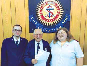 THE corps and band held a celebration evening in recognition of Bandsman Eric Davies’s 80 years of service. We thanked Eric for the way he has continued to serve his Lord with an assurance and faithfulness that is an example for others. He was presented with two more bars for his 50th ribbon and letters from Divisional Commander Lieut-Colonel Jonathan Roberts and Paul Sharman (THQ). Eric is pictured with corps leader Lieutenant Amy Bayliss-Fox and Acting Bandmaster Thomas Boor. – AB-F