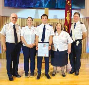 FRANKIE Baker was enrolled as a soldier by family friend Lieutenant Amanda Whitcombe (Lincoln). Frankie’s mum, Lieutenant Rachel Baker (Homelessness Services), read from Scripture. Frankie testified to her support and gentle encouragement as he moved towards his decision and spoke of a complete surrender to God’s will for his life. Also pictured are Recruiting Sergeant Major David Jackson and Robin Moorwood holding the flag. – LC