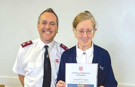 CORPS officer Major Matt Elsey presented Gwen Wyatt with a certificate in recognition of her long service as corps hall cleaner for 20 years. Gwen has now retired but is continuing as cleaner at Torquay Corps. It is a valued job that is needed. Well done, Gwen, for your years of service for the Lord. – AS