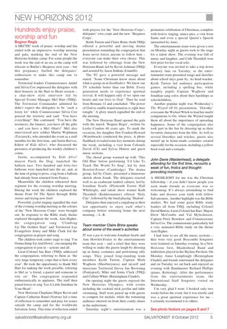premature celebration of Christmas, complete with festive singing, mince pies, a visit from Santa and even a special Queen’s Speech (presented by Ann). The entertainments team were given a rest on Monday night as guests took to the stage for a talent show. The evening was full of music and laughter, and Cath Thornhill won first prize for her vocal solo. Everyone was invited to take a trip down memory lane on Tuesday, as the entertainments team presented songs and sketches about school days gone by. As head teacher, Keith Turton led audience participation games, including a spelling bee, while naughty pupils Captain Waghorn and Jonathan sang solos about their hardships as schoolchildren. Another popular night was Wednesday’s The Wizard Of Oz presentation. ‘Dorothy’ overcame the Wicked Witch to lead her misfit companions to Oz, where the Wizard taught them all about the importance of spreading happiness. Some of the congregation also took part in the fun by dressing up as their favourite characters from the film. As well as several Dorothys and witches, guests also turned up in home-made costumes created especially for the occasion, including a yellow brick road and a tornado. John Davie (Maidenhead), a delegate attending for the first time, recounts a week of fun, frolics and thoughtprovoking moments A HIGHLIGHT for me was the Christian fellowship – if you didn’t know people you soon made friends as everyone was so welcoming. It’s always astonishing to find links and discuss your faith with fellow Salvationists. Another highlight was the Bible studies. We had some great Bible study leaders all from THQ, including Colonel David Hinton, Lieut-Colonel Ian Barr, Majors Drew McCombe and Val Mylechreest, Captain Peter Renshaw and Commissioner Silvia Cox. The commissioner particularly led a very animated Bible study on the theme Aim Higher. I had time to see all the music sections – they were very good. Boscombe Songsters were featured on Saturday evening. In a New Horizons first, Maidenhead Band and timbrelists played in the Skyline Pavilion. On Monday Anna Lamplough (Birmingham Citadel) and friends entertained the delegates and on Tuesday we sat back and enjoyed an evening with Bandmaster Richard Phillips (piano, Kettering). After the performance from the entertainments team, the International Staff Songsters visited on Wednesday. I’m very glad I went. I booked only two weeks before the event, but it was terrific and was a great spiritual experience for me – I certainly recommend it to others. See photo feature on pages 6 and 7