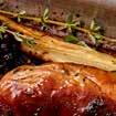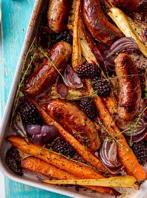 Roast the sausages in a tray for 10 minutes, then add the onions, parsnips, carrots and blackberries. Add a generous amount of olive oil and season with salt, pepper and a few sprigs of thyme.
