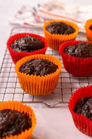 Divide the mixture between 8 cases on a muffin tray and bake in the oven for 40 minutes. Test with a skewer to see if the muffins are done. The muffin mixture may be slightly wet, but should not be runny.