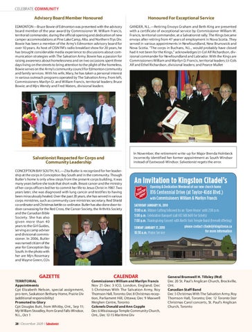 General Bramwell H. Tillsley (Rtd) Dec 20 St. Paul’s Anglican Church, Brockville, Ont. Canadian Staff Band Dec 5 Christmas With The Salvation Army, Roy Thomson Hall, Toronto; Dec 12 Toronto Star Christmas Carol concerts, St. Paul’s Anglican Church, Toronto