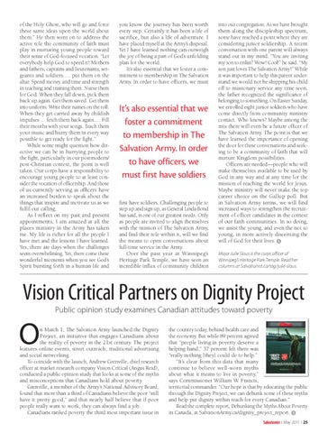 the country today, behind health care and the economy. But while 89 percent agreed that “people living in poverty deserve a helping hand,” 37 percent felt there was “really nothing [they] could do to help.” “It’s clear from this data that many continue to believe well-worn myths about what it means to live in poverty,” says Commissioner William W. Francis, territorial commander. “Our hope is that by educating the public through the Dignity Project, we can debunk some of these myths and help put dignity within reach for every Canadian.” Read the complete report, Debunking the Myths About Poverty in Canada, at SalvationArmy.ca/dignity_project_report. Salvationist I May 2011 I 25