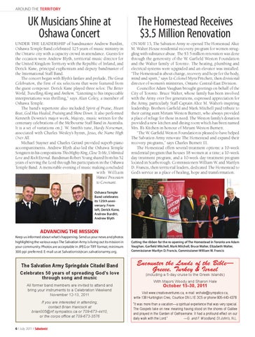 The Salvation Army Springdale Citadel Band Celebrates 50 years of spreading God’s love through song and music All former band members are invited to attend and bring your instruments to a Celebration Weekend November 12-13, 2011 If you are interested in attending, contact Brian Hancock at brian005@nf.sympatico.ca or 709-673-4410, or the corps office at 709-673-3576 6 I July 2011 I Salvationist