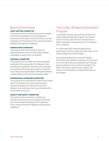 The Under-35 Board Participant InProgramApril2021,the Board approved the concept of an Under-35 Board Participant Program. This initiative ensures that the under-35 cohort of Salvationists is able to participate in the governance of The Salvation Army in Australia.