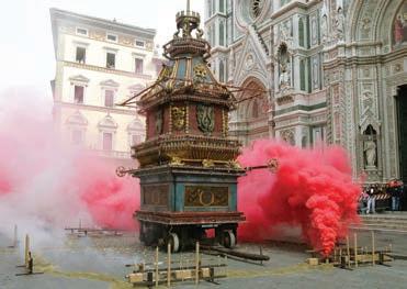 Cart’. On the morning of Easter Sunday, two oxen pull a three-storey high wagon through the streets to the front of the cathedral, accompanied by drummers, flag throwers and people in historical costumes. The cart is then filled with fireworks. During Easter mass the Archbishop of Florence lights a fuse that sends a dove-shaped rocket down a wire to the cart, setting off a brilliant display of fireworks.