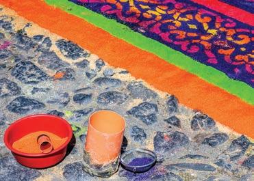 Cobblestone roads in Antigua, Guatemala, are transformed into colourful carpets with stencilled illustrations covering traditional and religious themes, made using coloured sawdust, vegetables and flowers. The Good Friday procession over the carpets is followed by a clean-up team that sweeps up all remains of the art.