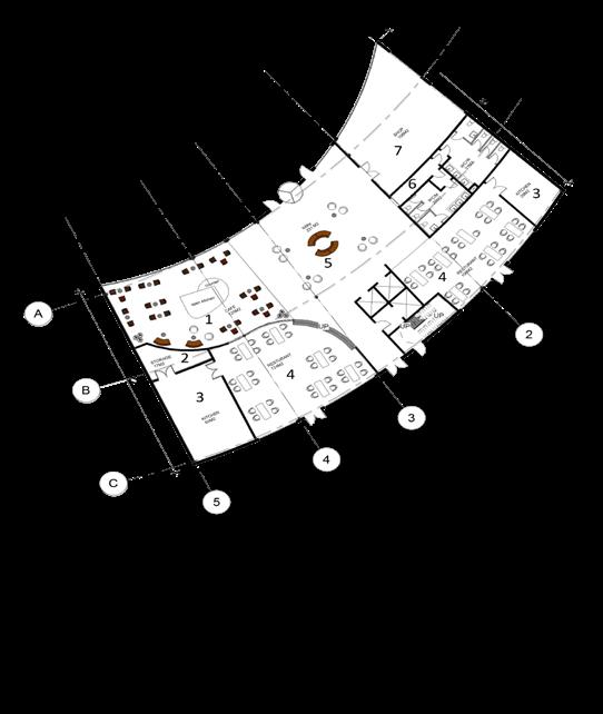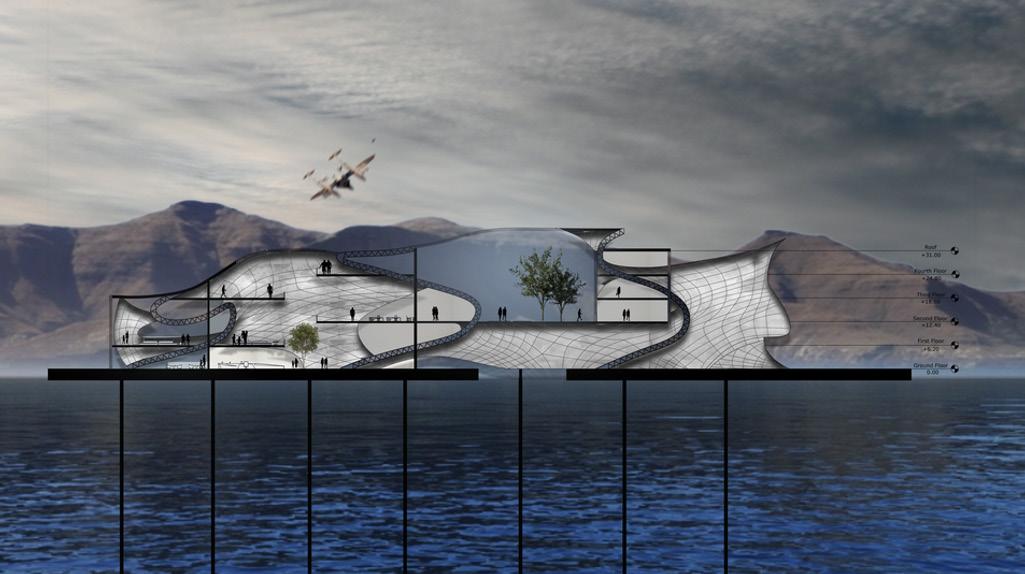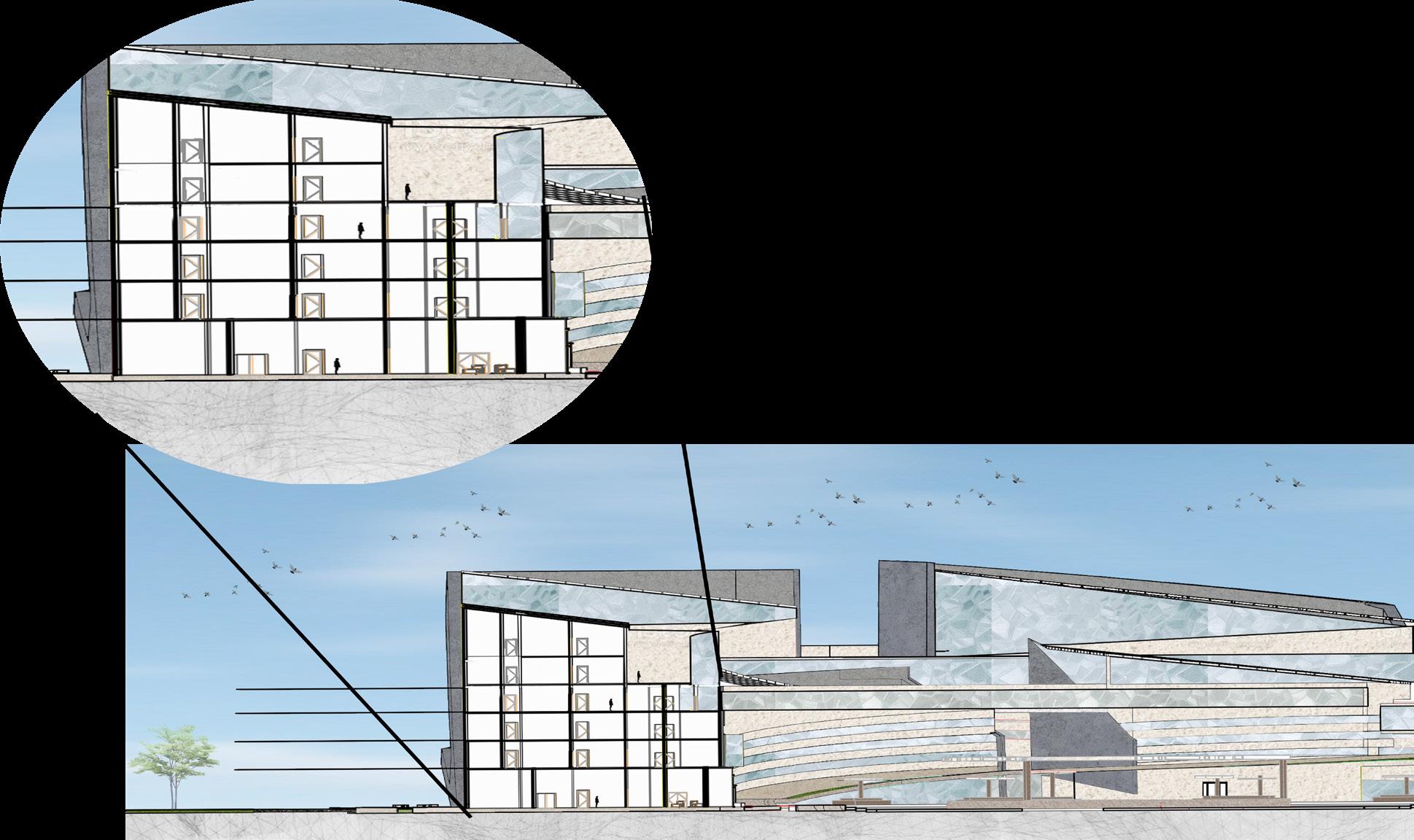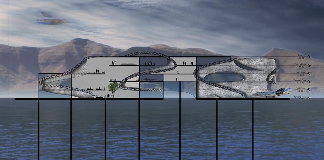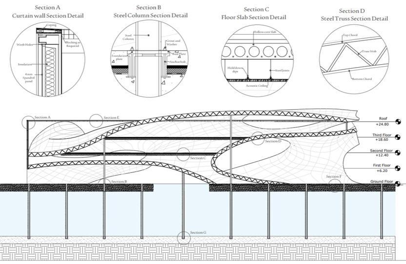 Sections shows the fluidity inside the building and how does the minimal surface disributed the zones and the areas inside the building. the structural section of the gyroid, including features of the curtain wall, hollow-core slab, and steel truss system used with the gyroid and steel columns underwater.