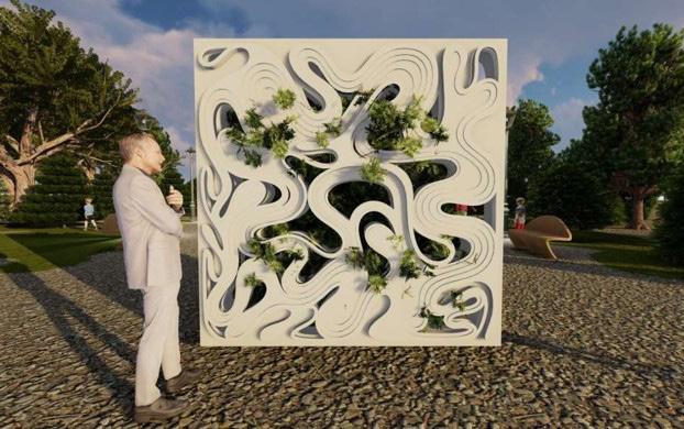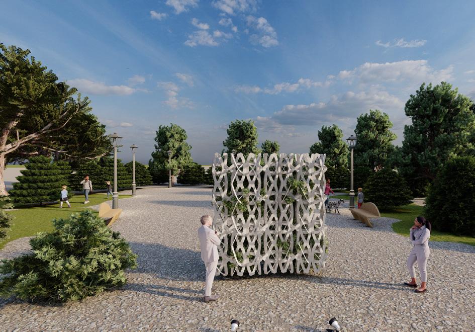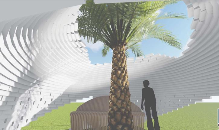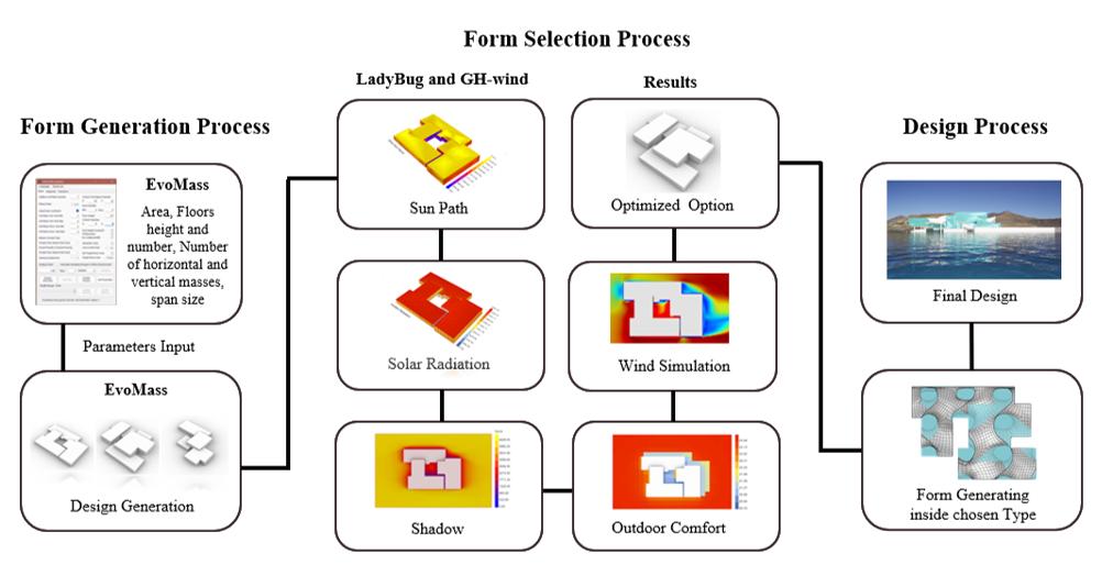 The concept behind this project is to generate a form based on some analysis. At the beginning of the design optimization process, we generated 30 3D masses using EvoMass. After that, we start analyzing the shadow,wind simulation, solar radiation, and thermal comfort for the masses, and we have chosen the most comfortable mass for people. The design process started by generating different Gyroid shapes inside the chosen optimized environmental mass. The Gyroid is a minimal surface that belongs to the Schwarz P and Schwarz D surface families. The gyroid has no straight lines or planar symmetry; it is a triply periodic minimal surface.