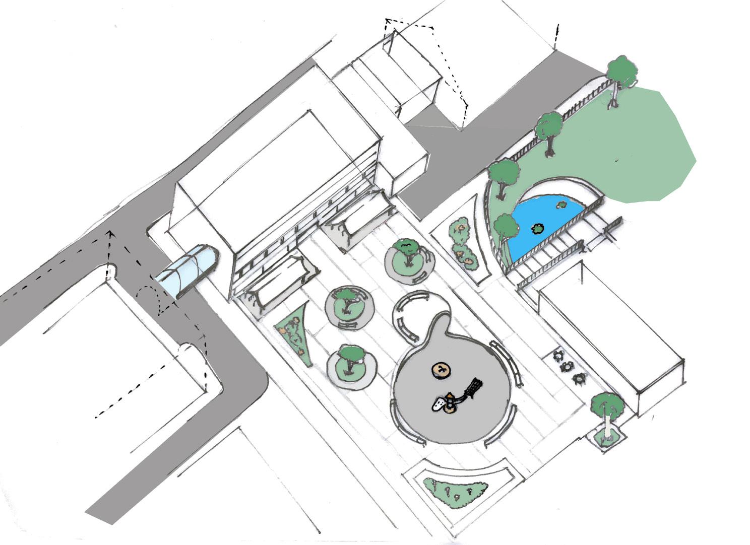 Central space with di erent colour paving designs indicating direction ( shown in green arrows on plan)