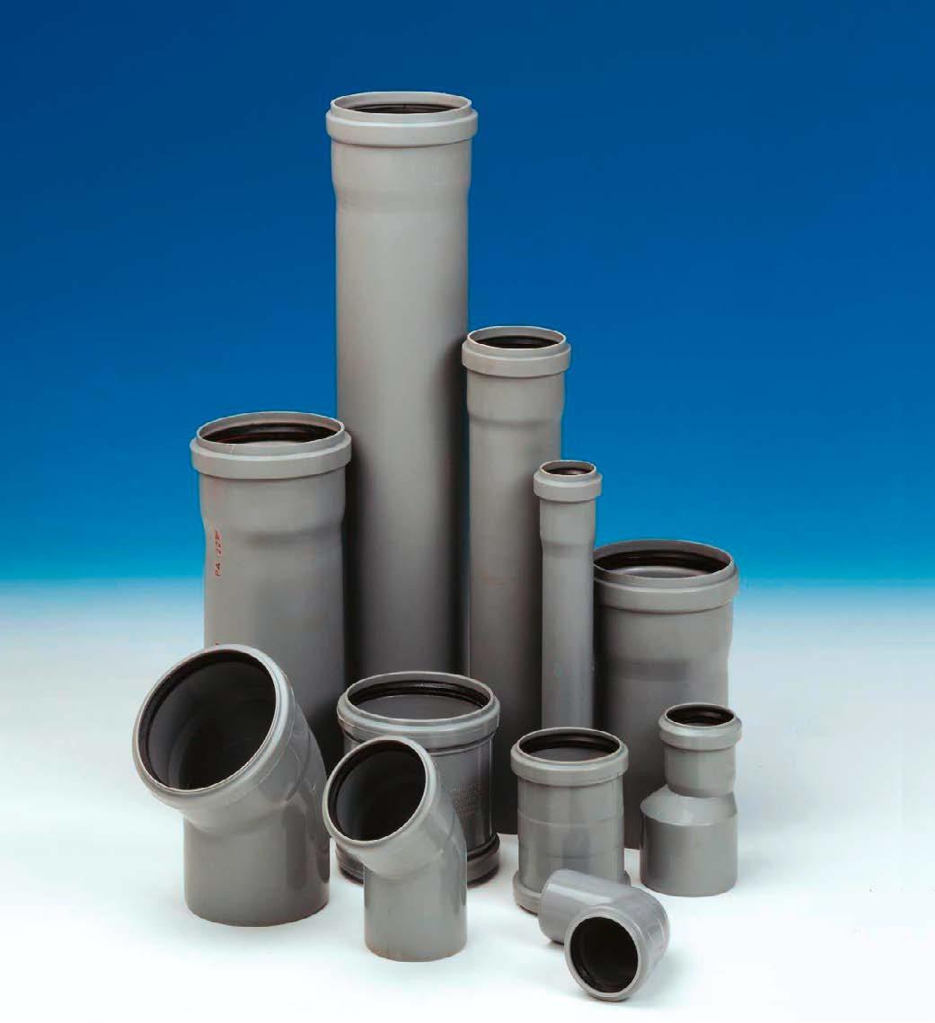 HT-Entwässerungssysteme aus Polypropylen sind heißwasserbeständig und werden in verschiedenen Durchmessern zur Gebäudeentwässerung im Innenbereich verwendet.