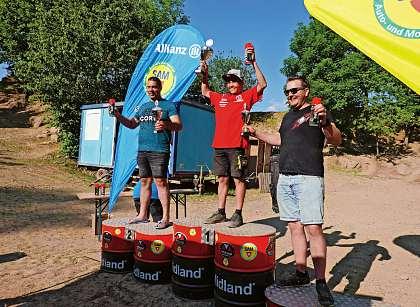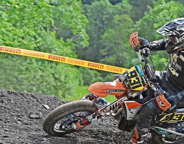 Hintz produzierte erneut einen Superstart aus der zweiten Reihe und lag nach 6 Fahrminuten schon wieder auf Siegeskurs «Ich versuchte, als ich vorn war, einige schnelle Runden zu fahren und dabei noch den gröbsten Steinbrocken auszuweichen», so der nun mit Punktemaximum SM-Führende Dahinter sicherte Haenggeli die zweite Position ab und hielt den weiterhin superschnellen Tageslizenzler Züger auf Distanz Tschupp, der 2021 den Meistertitel einfuhr, musste erneut den Angriffsmodus zünden, um weiterhin möglichst viele Punkte an Land zu ziehen Yannick Bärtschi, der 24-jährige Lokalmatador und Titelverteidiger, konnte im Spitzenkampf nicht mitmischen Der Zachmann-KTM-Pilot klagt immer noch über Probleme mit dem letztjährig hier gebrochenen Handgelenk Nach einem Sturz im Offroadteil von Simon Constantin und Justin