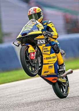aus, als würde er mit seinen Konkurrenten Katz und Maus spielen Exemplarisch im zweiten Durchgang, da lag er hinter dem führenden Tanguy Prost in Lauerstellung Er liess den Franzosen lange Zeit gewähren, hielt den Abstand zu ihm aber in Grenzen Wenige Runden vor Schluss war dann aber fertig lustig, Tonus attackierte entschlossen und setzte sich wie erwartet an die Spitze des langgezogenen Feldes Den Sieg fuhr der 31-jährige Romand locker nach Hause «Ich bin seit gut 10 Jahren nicht mehr rennmässig auf einer 250er gefahren», sagte der Sieger zufrieden und gut gelaunt im Interview mit dem SAM-TV Während des Rennes habe er ein paar Anpassungen an der Maschine vornehmen müssen, über alles