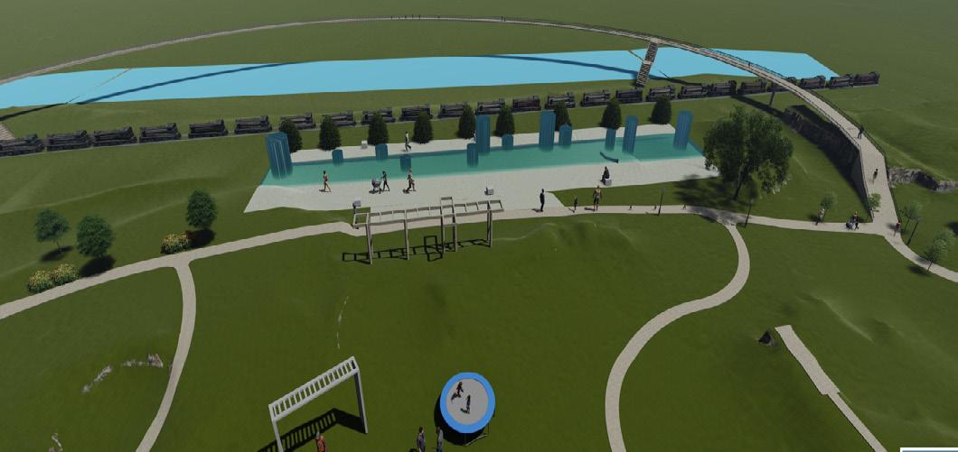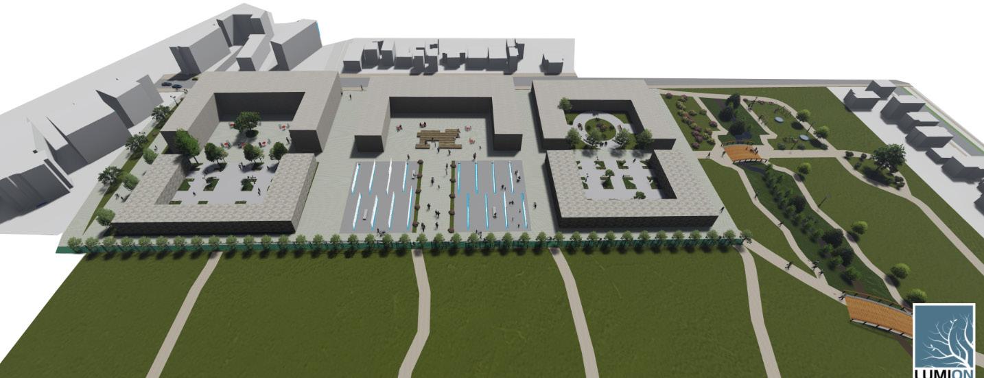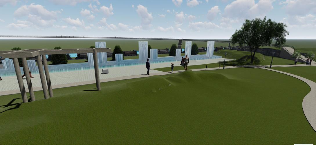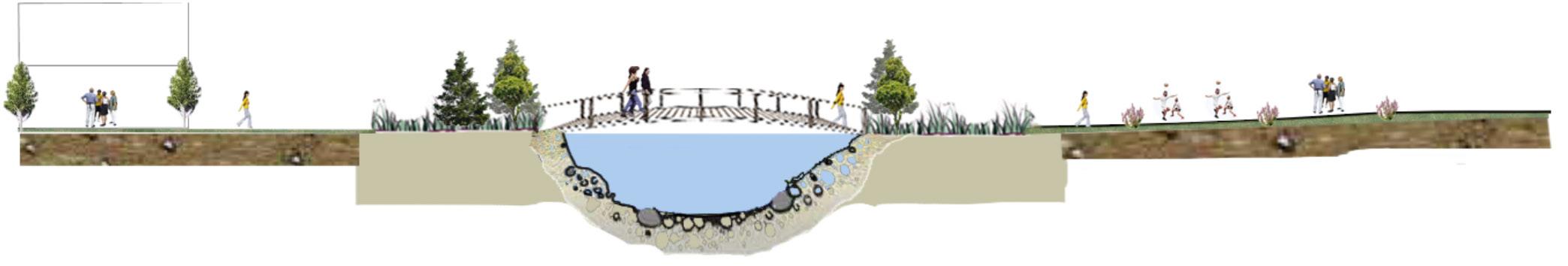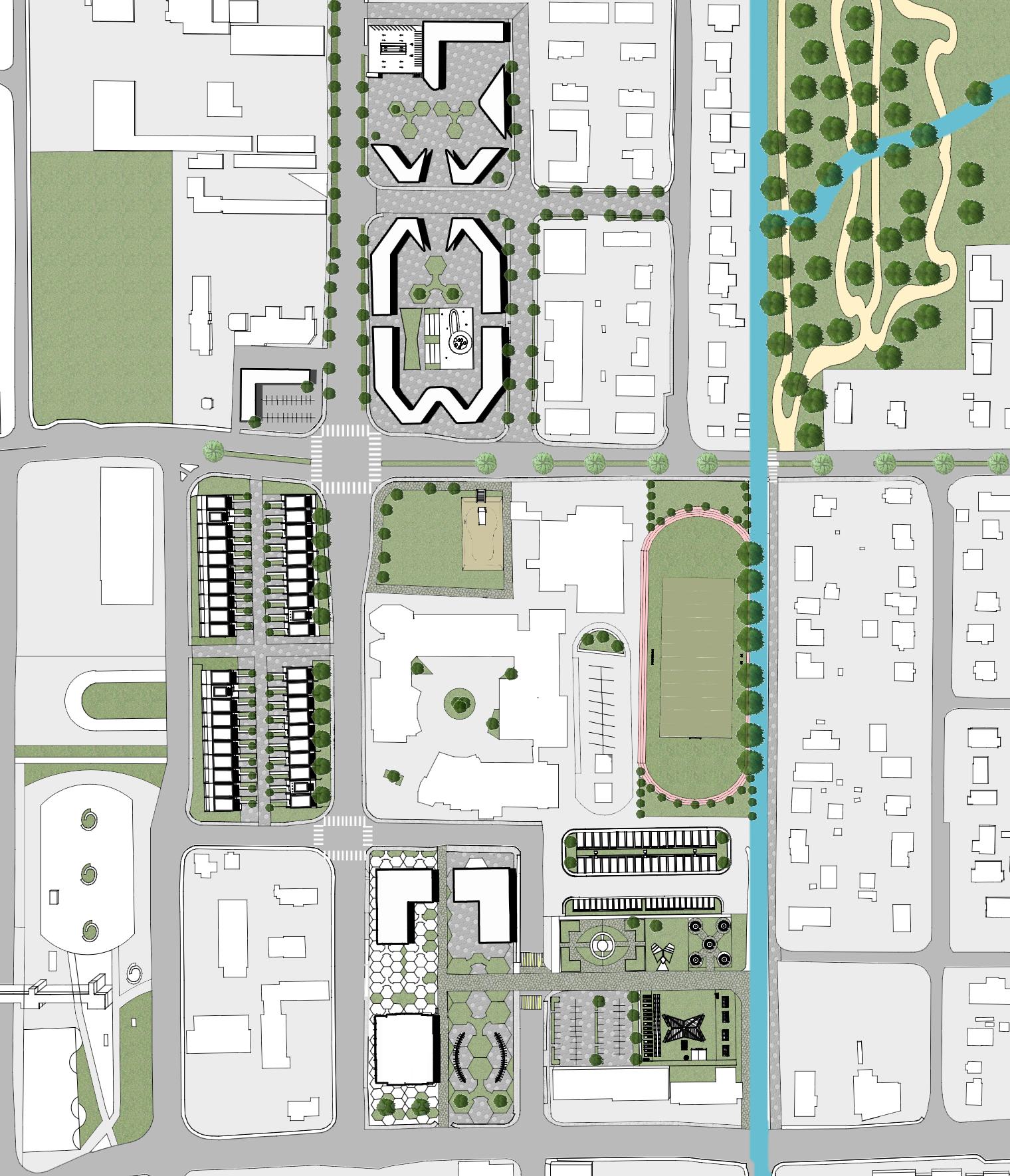Riparian Corrdior Activiation will give a nice space that would attract the community to spend their time at the site that offers different ac tivities with their children and elderly people. Activating the riparian corridor will be a response for the climate purposes as well as to give the children opportunity to enjoy the space even more. The proposed two floor building will encourage the residents to sit and enjoy both the semi private yards as will as the view of the public floor fountain that locates next to it.