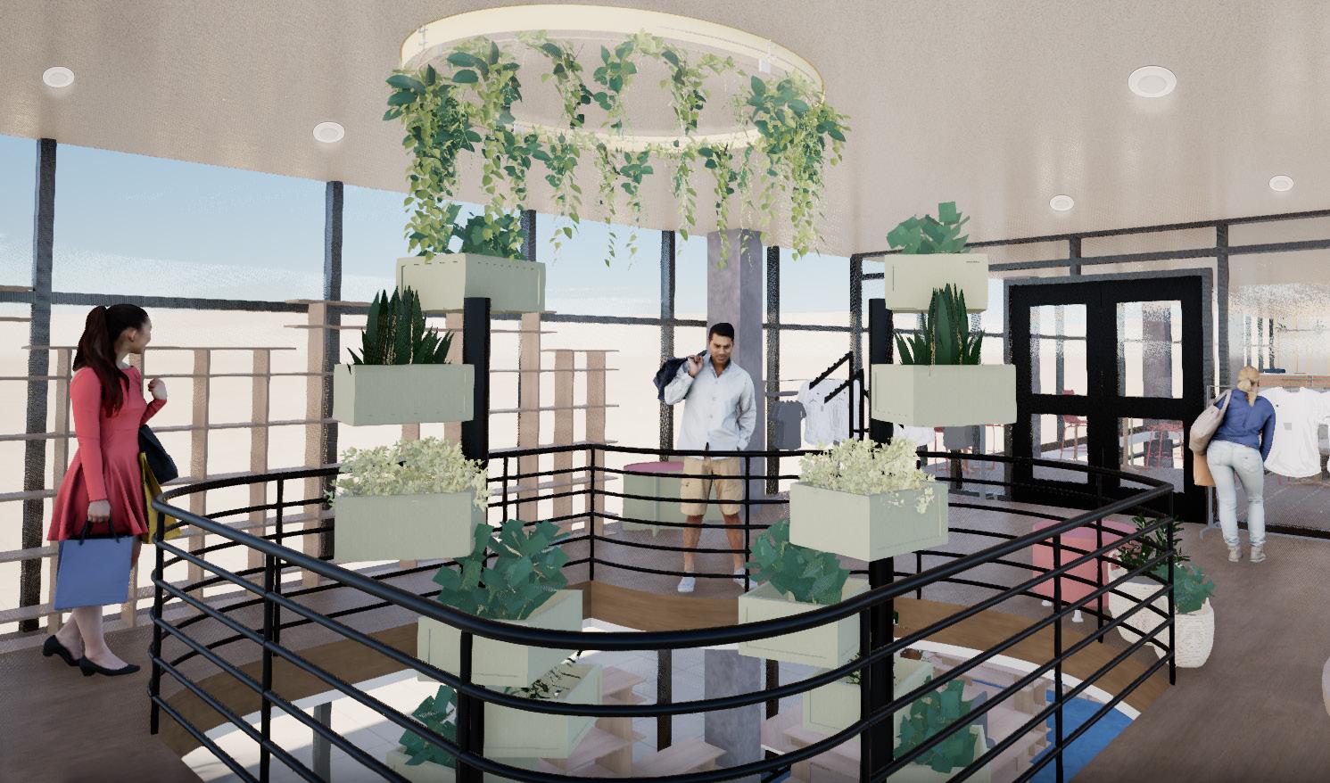 Throughout the multi-level shopping center, plants are seamlessly integrated, ranging from hanging foliage to a spiral plant feature that bridges the two floors.