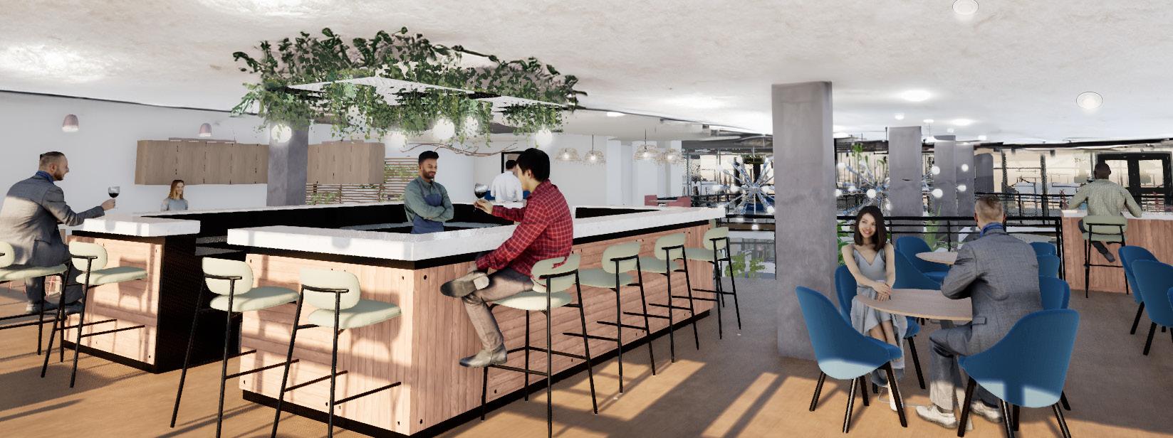Fosusing on five main goals: design for Integration, Equitable Community, Economy, Well-Being, and Discovery, three main types of spaces were created, resulting in an open-concept bar, seating/dining, and various lounge areas.