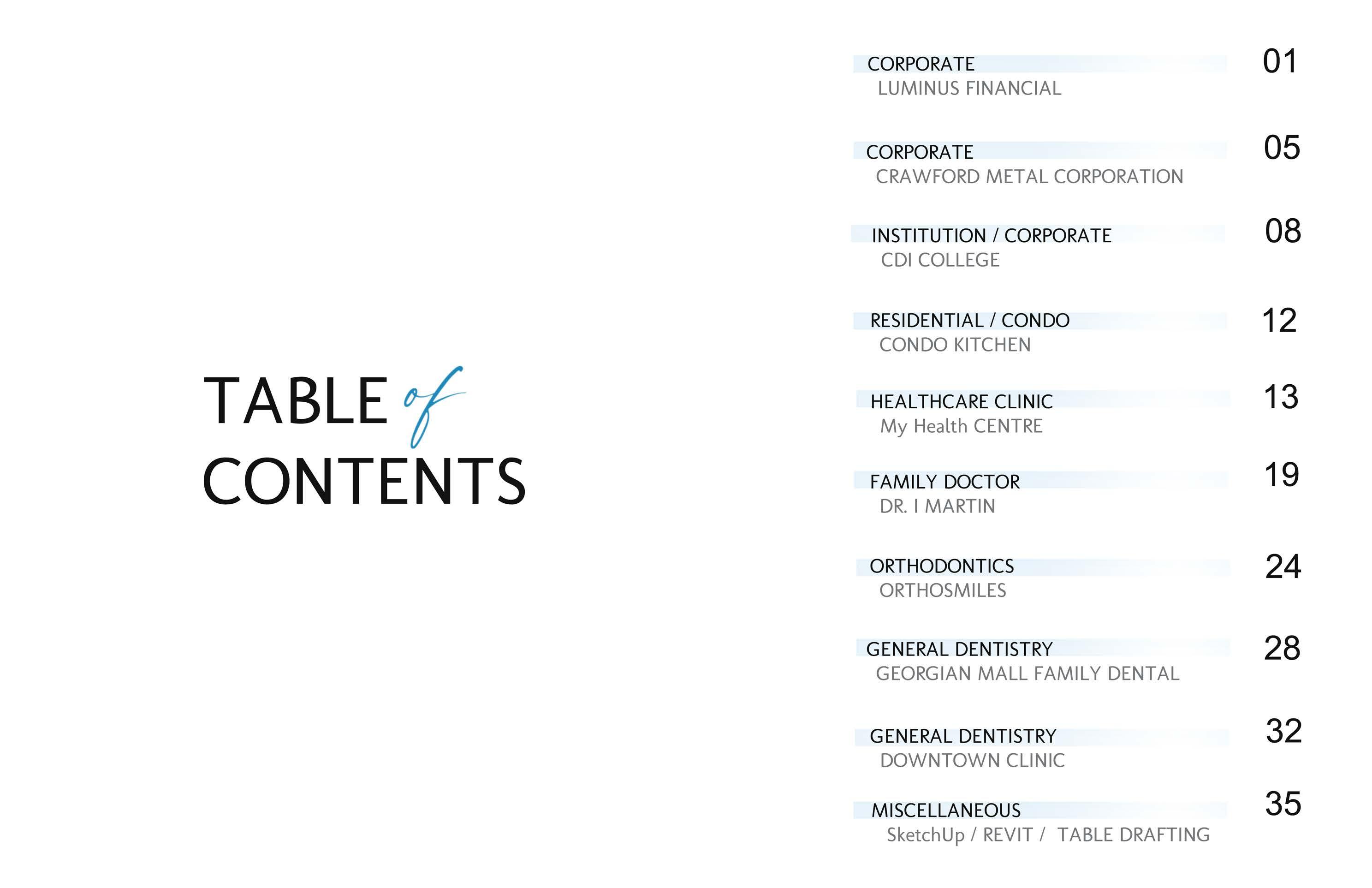 TABLE CONTENTS CORPORATE 0 1 LUMINUS FINANCIAL CORPORATE 05 CRAWFORD METAL CORPORATION INSTITUTION I CORPORATE 08 CDI COLLEGE RESIDENTIAL I CONDO 12 CONDO KITCHEN HEALTHCARE CLINIC My Health CENTRE FAMILY DOCTOR DR. I MARTIN ORTHODONTICS ORTHOSMILES GENERAL DENTISTRY GEORGIAN MALL FAMILY DENTAL GENERAL DENTISTRY DOWNTOWN CLINIC MISCELLANEOUS SketchUp I REVIT I TABLE DRAFTING 13 19 24 28 32 35
