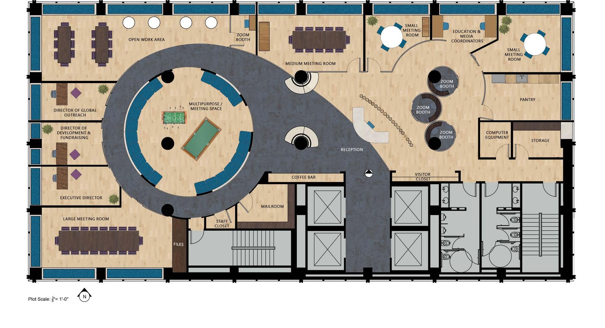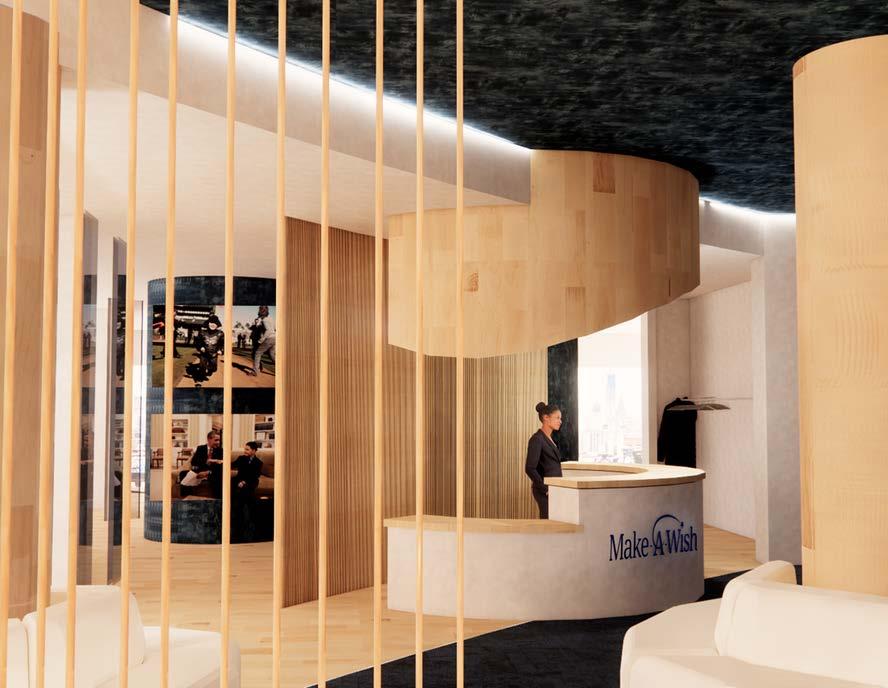 This office space is meant to comfort those who enter the Make-A-Wish space. Although the space is meant for volunteers of the non-profit, it is important that the children who's wishes are being granted; as well as, their famiilies feel comfortable and welcome. The layout of the office focusses on the central wish of a child. That wish is supported by many factors including those who run the non-profit, expressed in the surroundingworkplaces.