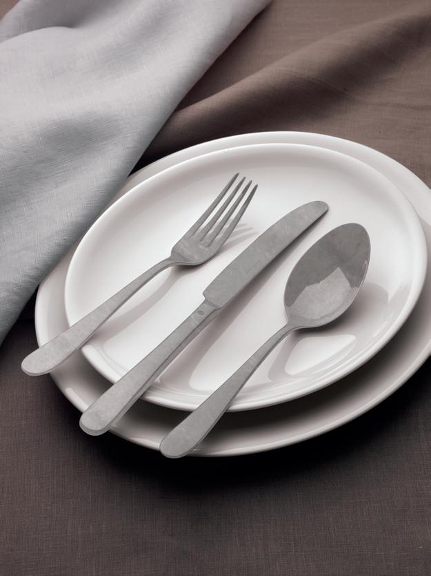 A special craftsman finishing technique on the surface of the stainless steel cutlery. Through a series of industrial scraping processes, surfaces assume an original and intentionally “worn out” effect, introducing a new and fascinating ambiance at the table and a new trend for contemporary