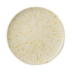 Raggi nelle nuance del giallo e dell’oro si irradiano dal centro verso i bordi dei piatti, caratterizzando la neutralità delle superfici