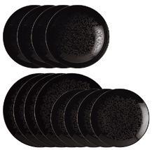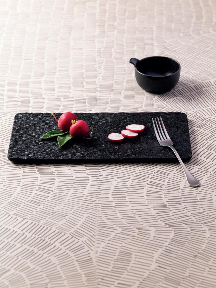Accenti gloss, delicati contrasti tattili ed essenzialità. La mise en place si connota quindi in una dimensione soft che privilegia le superfici e la frequenza della luce che la porcellana emana, nel morbido candore del bianco e nella profondità del nero assoluto. Il particolare decoro opaco applicato allo smalto della porcellana –così come una eclissi lunare – interrompe la luminosità propria del materiale, dando vita a una texture amplificata.
