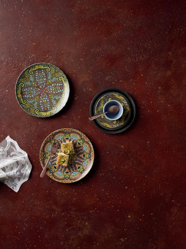 Un’articolata collezione tavola che trova la propria particolarità nella ricchezza cromatica e nei quattro sofisticati motivi che la compongono, tutti votati all’arte della tessitura e alla simbologia, tipica degli antichi manufatti orientali. Un susseguirsi di volute floreali ed elementi ornamentali quasi calligrafici, che si alternano al rigore e dall’austera ripetizione di ordinati motivi geometrici.