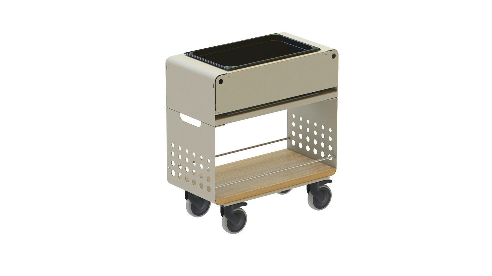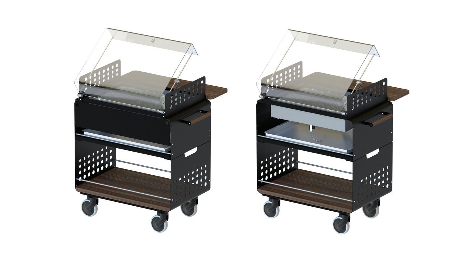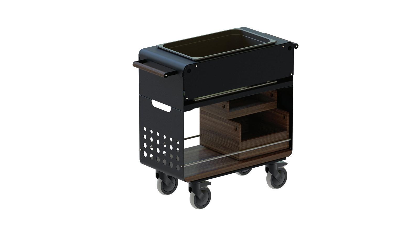 The built-in GN 2/1 container in stainless steel can be filled with ice to showcase the catch of the day or covered with a stoneware plate present oysters and raw seafood, transforming the trolley into a mobile plateau royal