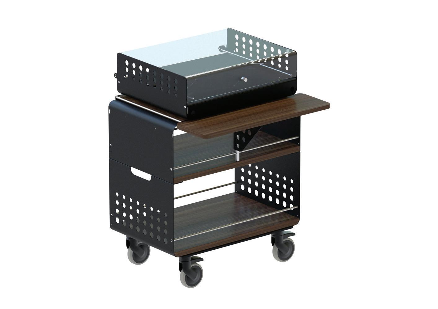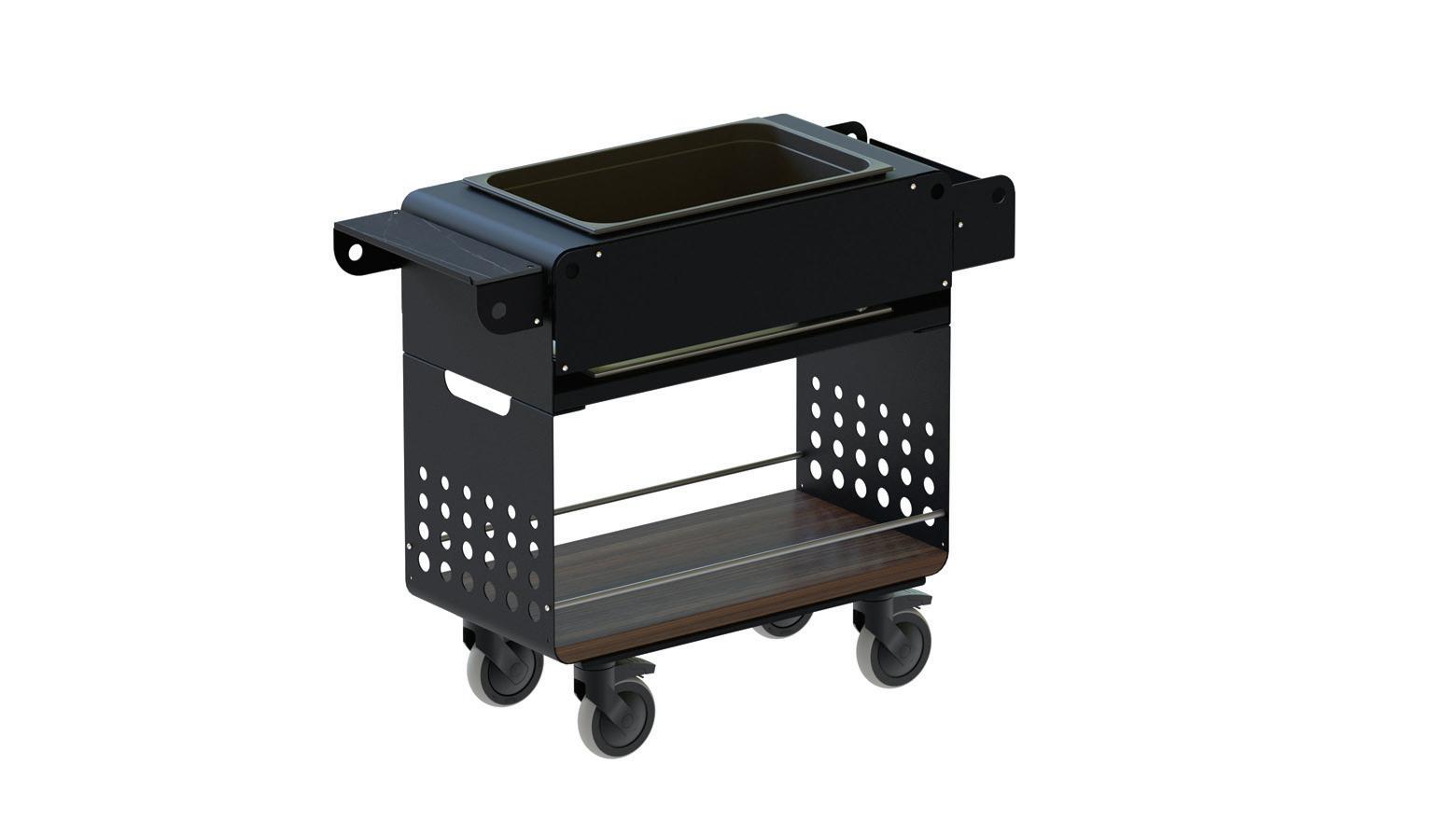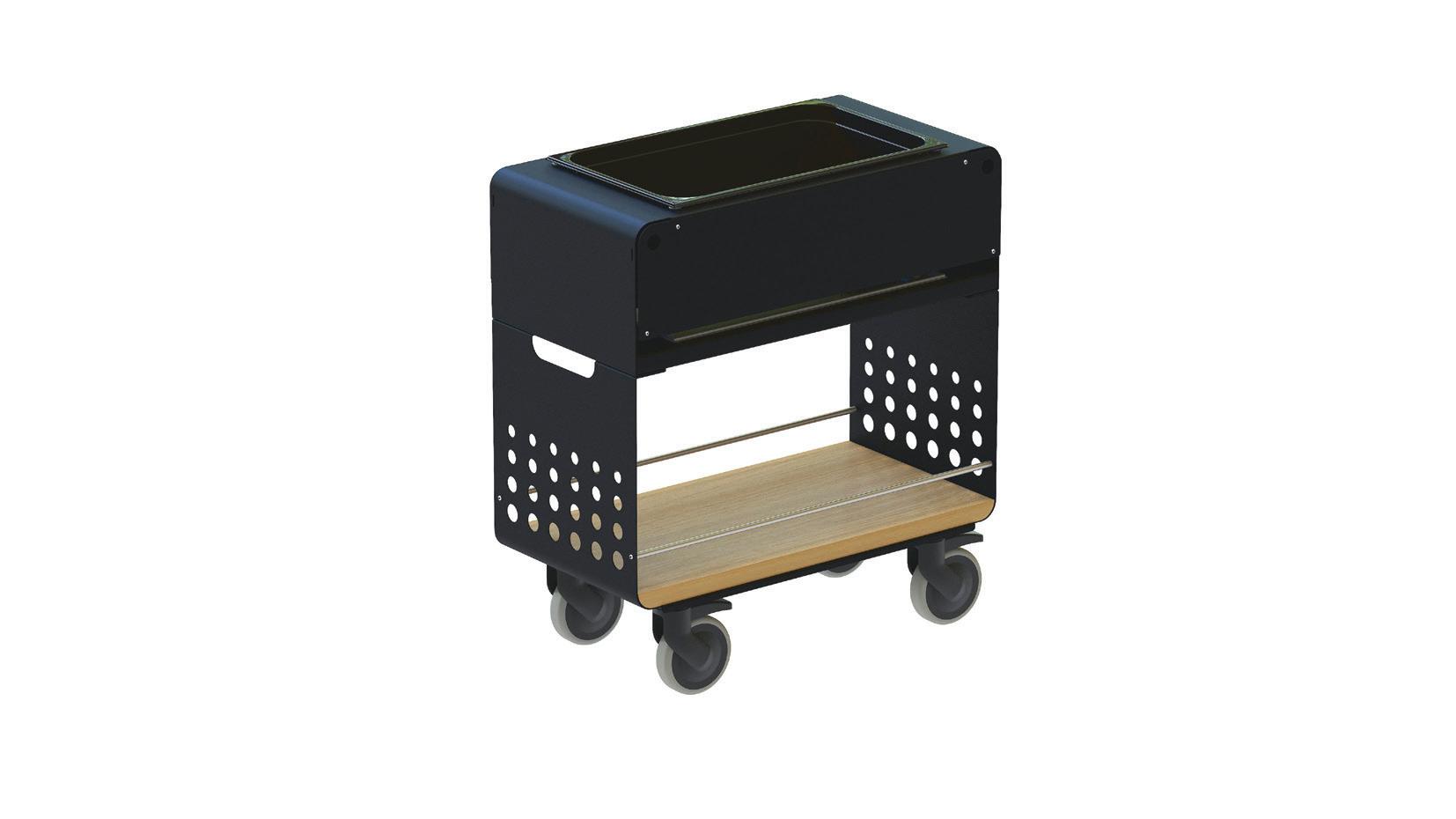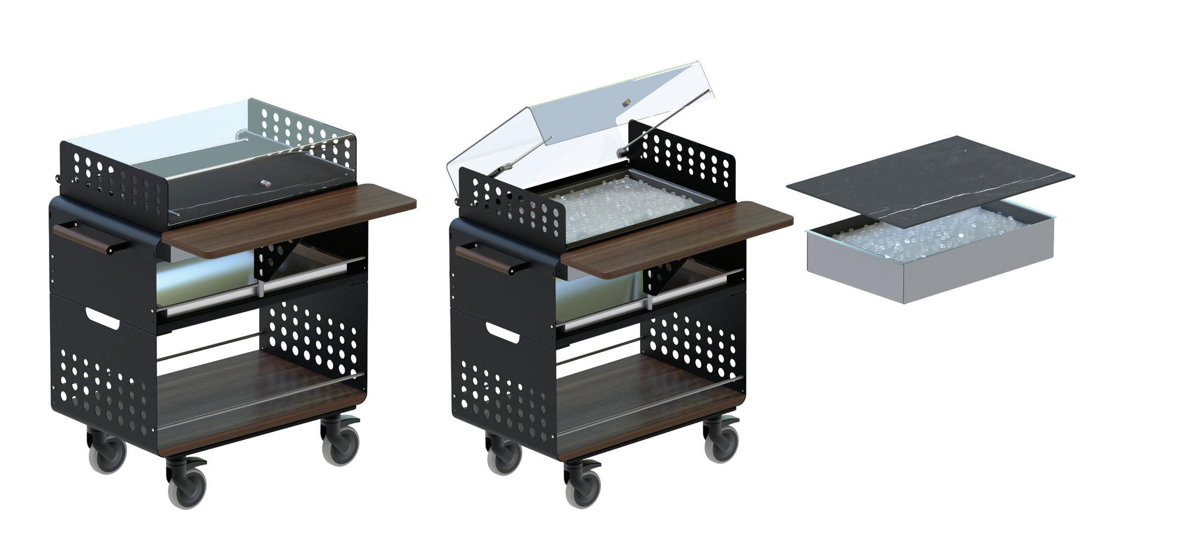 The built-in GN 2/1 container in stainless steel can be filled with ice to showcase the catch of the day or covered with a stoneware plate present oysters and raw seafood, transforming the trolley into a mobile plateau royal