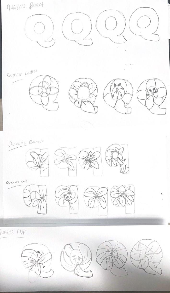 Flowering typography was my first time truly working with Adobe Illustrator. I had used it shortly in high school, but I had never really used all the tools and features that the application has to offer. The project prompt was to select a flower and integrate it into your given letter. The flower however had to start with the same letter as the letter you were given. I was given the letter Q and chose queens cup as my flower.