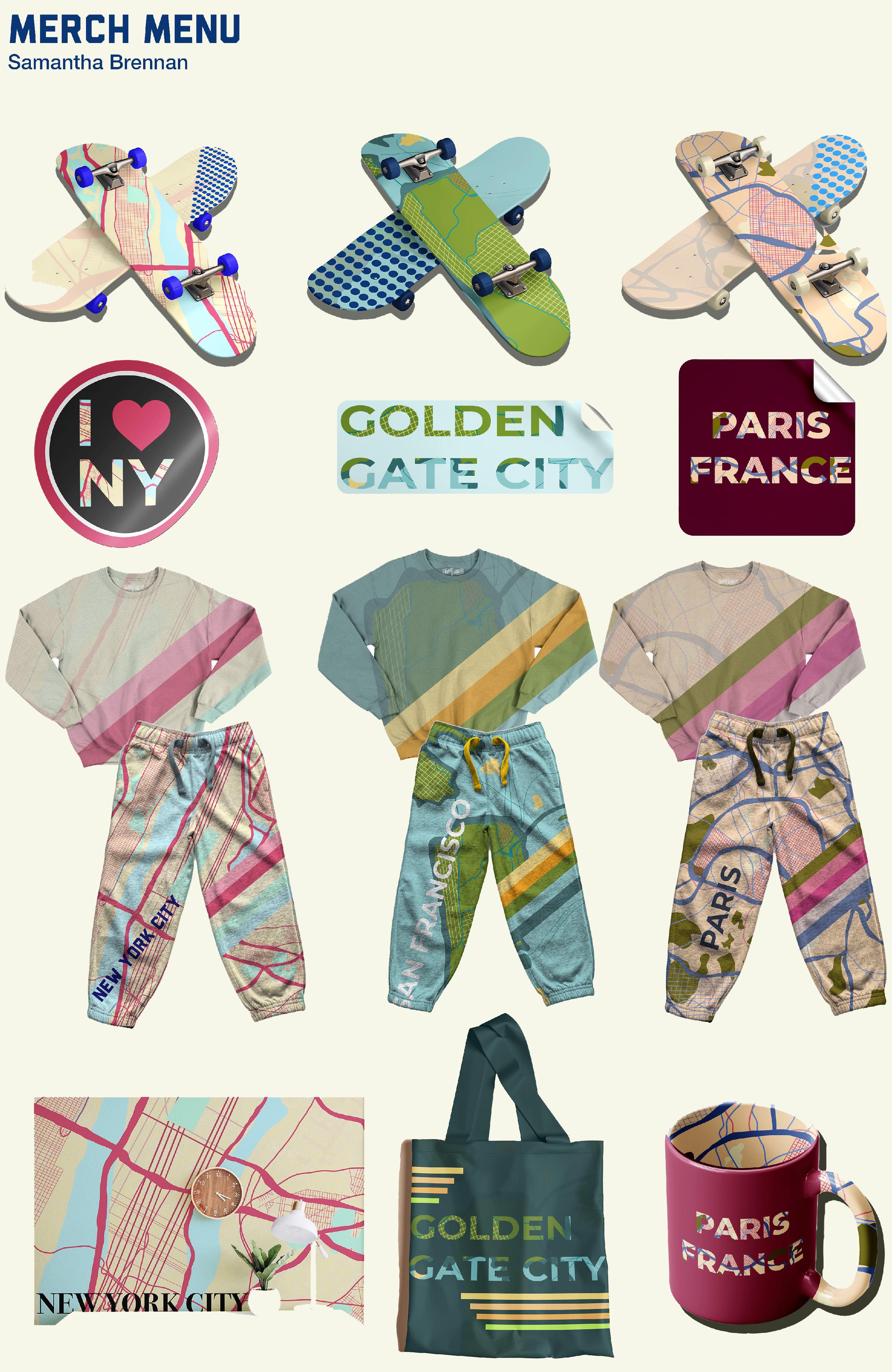 I began with a mood board and expanding my idea from a theme of sketches I had, which was travel and city style drawings. I decided upon drawing my own set of maps of cities. I chose to focus on New York City, Paris, and San Francisco. All three to me varied within aesthetics while also being major cities that are high tourist attractions and have memorable attributions. My three maps all varied but had consistent color pallets and had similar line weight and saturations.