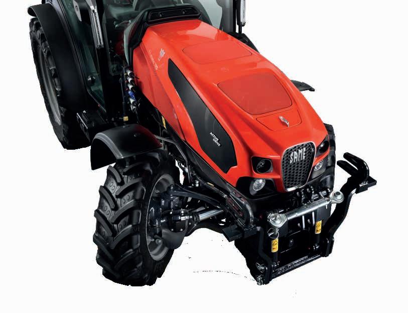 portate. Dei comodi pulsanti posizionati sul retro della console o sul parafango sinistro permettono all’operatore di azionare il sollevatore posteriore con movimenti precisi e progressivi così da facilitare le manovre di accoppiamento con gli attrezzi posteriori. Il sollevatore posteriore dei modelli Frutteto ha una capacità di sollevamento di 3130 kg (2600 kg sulle versioni S e V), che può essere aumentata a 3940 kg con i pistoni ausiliari aggiuntivi. Tutti i modelli sono offerti con attacco opzionale a tre punti con stabilizzatori regolabili idraulicamente e tirante destro, alimentati da distributori dedicati e sollevatore anteriore con portata di 1500 kg, appositamente sviluppato da SAME per questa famiglia di trattori e perfettamente integrato nel design anteriore del Frutteto. Quando non in uso, è possibile ripiegare i bracci inferiori per ridurre l’ingombro.