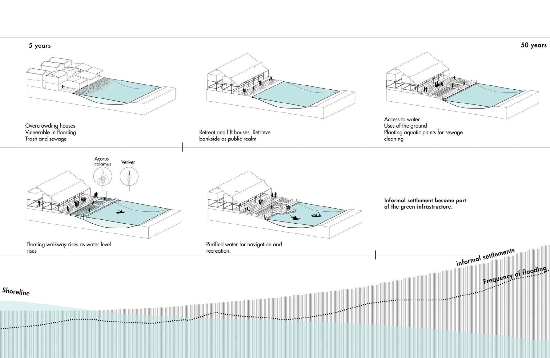 In the Chao Phraya project, mangrove forests are restored, elevated walkways increase the possibility to safely navigate, and shrimp ponds are retrofitted to become ecosystem regrowth points. New civic buildings, adapted to local vernaculars, are hubs for gathering and organizing community-based restoration efforts. This active restoration will take time, and the renderings depict the evolving ecological condition over several decades of care.