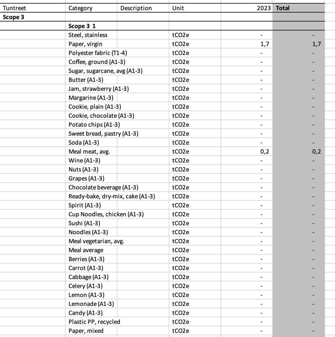 Tuntreet viser et totalt (kun Scope 3) klimagassutslipp på 2 tCO2eq for 2023. De største utslippene er tilknyttet trykk av studentavis og mat. Se vedlegg 3 «Nøkkeltall Tuntreet» for en mer detaljert oversikt.