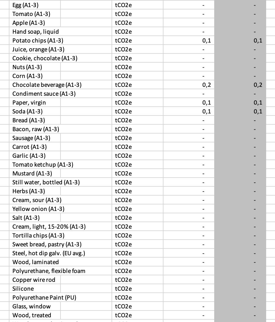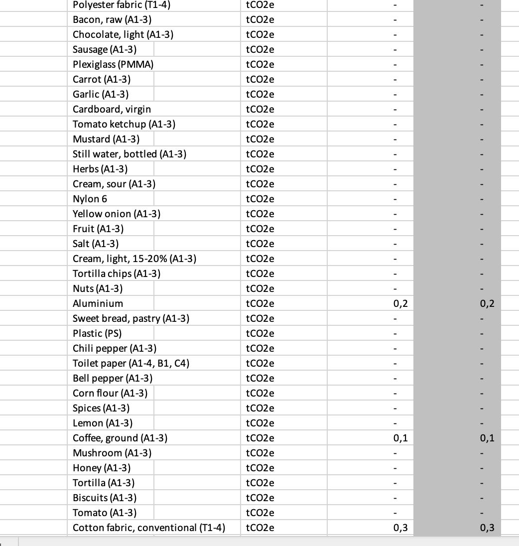 Mange av utslippsfaktorene inkluderer flere steg i produksjonsprosessen fra råmaterialet til ferdig produkt og er markert med T1-4 for materialer og A1-3 for mat- og drikkevarer.