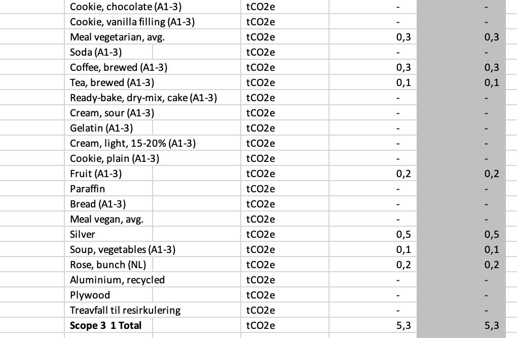 Vi har lagt inn tallene som total kg og liter per mattype og drikkevare. For måltider er dette lagt inn per måltid fordelt mellom utslippsfaktorer som «vegetarian meal», «meat meal», «fish meal» og «average meal».