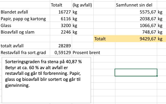 Data er hentet fra Stena recycling og for hentepunkter som samfunnet leverer søppel til. Av hentet mengde avfall tilfaller ansvaret for 1/3 til samfunnet, som er den økonomiske fordelingsnøkkelen som benyttes for sameiet mellom samfunnet, NMBU og SiÅs. Av restavfall antas en utsorteringsgrad på 23% etter tall fra Stena recycling. Det betyr at 77% av restavfallet antas å gå til forbrenning og klima belaster deretter mens 23% ikke utgjør en klimabelastning da det går til materialgjenvinning etter 0:100 prinsippet.