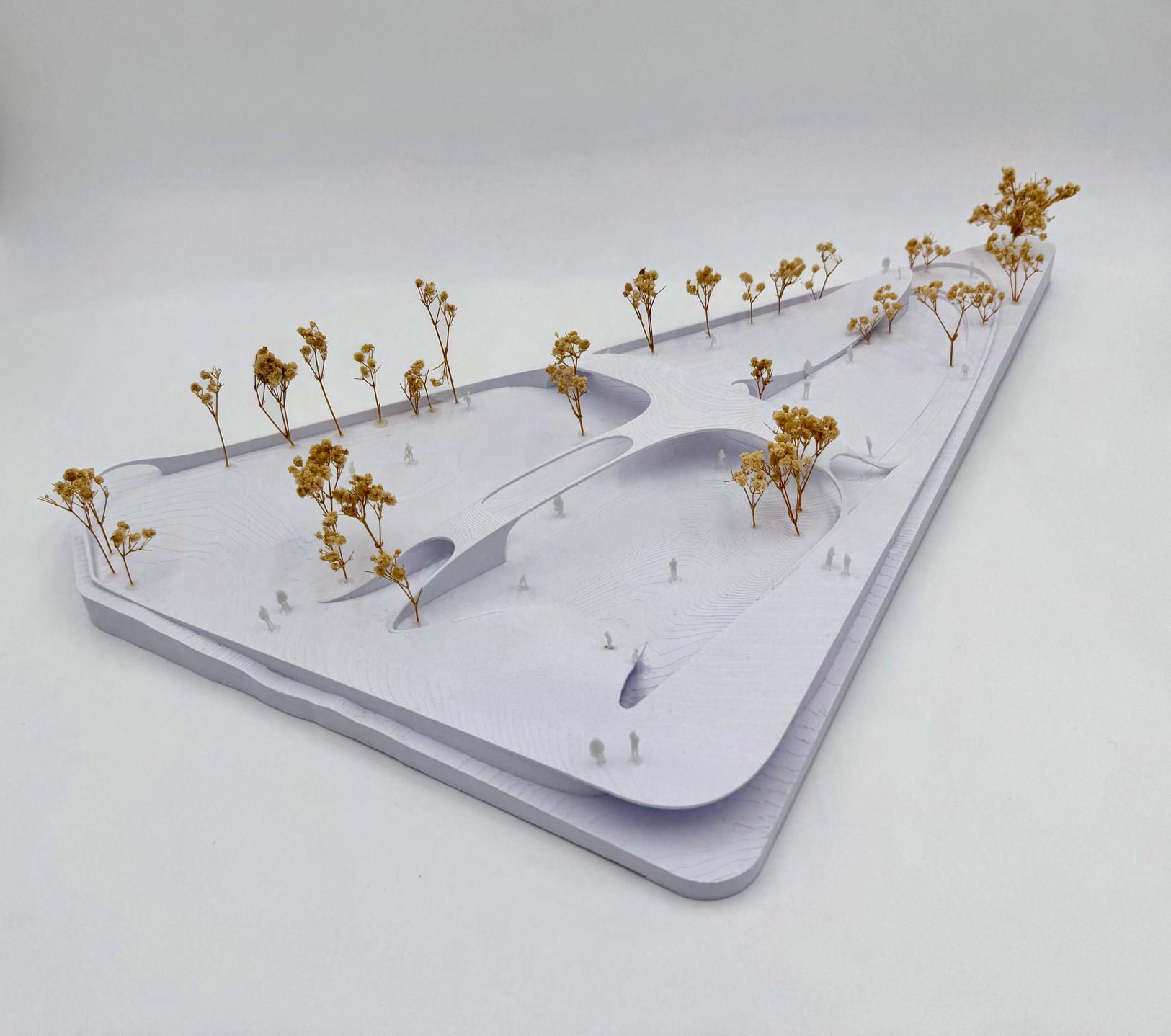My team chose the Lakefront Kiosk, designed by Ultramoderne. Its radial structural system implies a focal point in the space, which we wanted to use in order to emphasize the most exciting conditions of the site’s existing slope and view corrdiors.