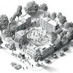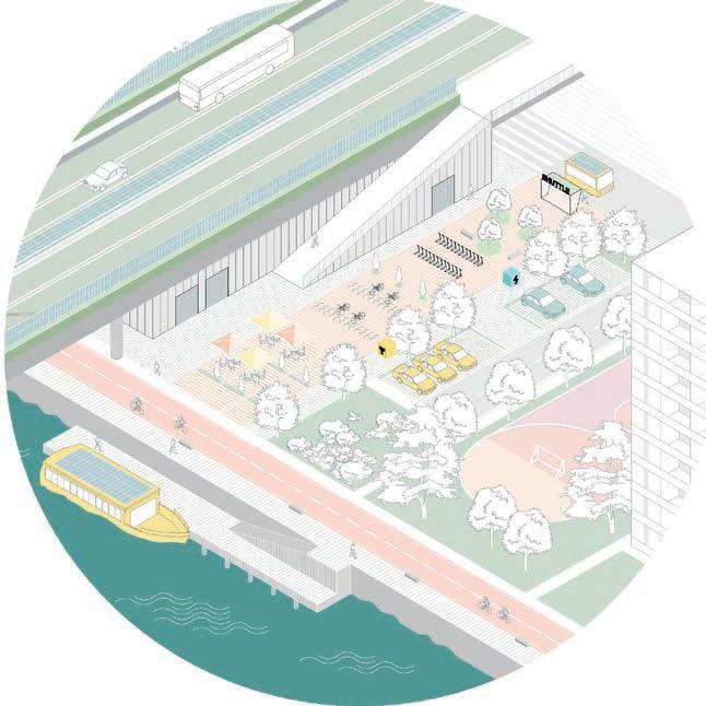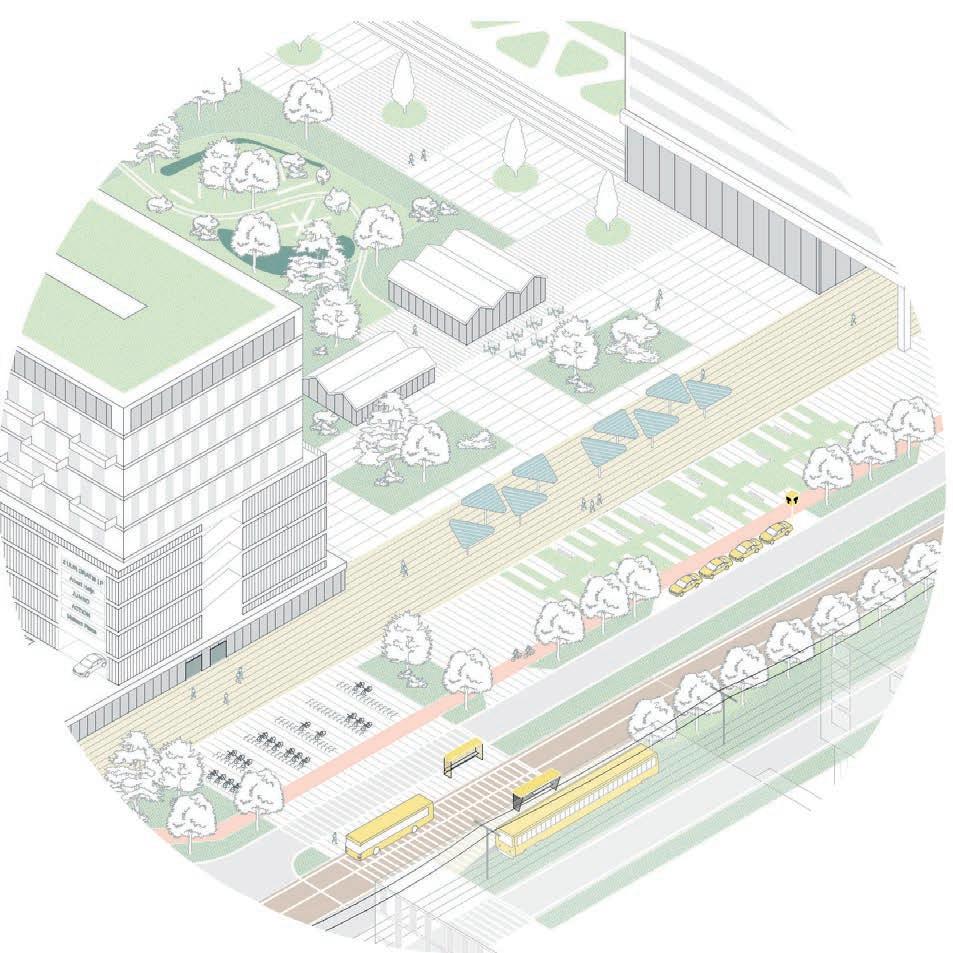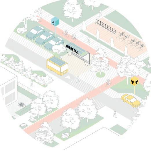 vehicles through convenient amenities and well-planned walking and cycling paths. Street-level hubs transform roads into shared spaces, prioritizing pedestrian safety and community interaction. Throughout, our design integrates features such as greeneries and punlic spaces, and sensory cues to cater to diverse abilities. By emphasizing sustainable mobility and inclusivity, our urban strategy shapes a connected, eco-conscious, and user-friendly cityscape