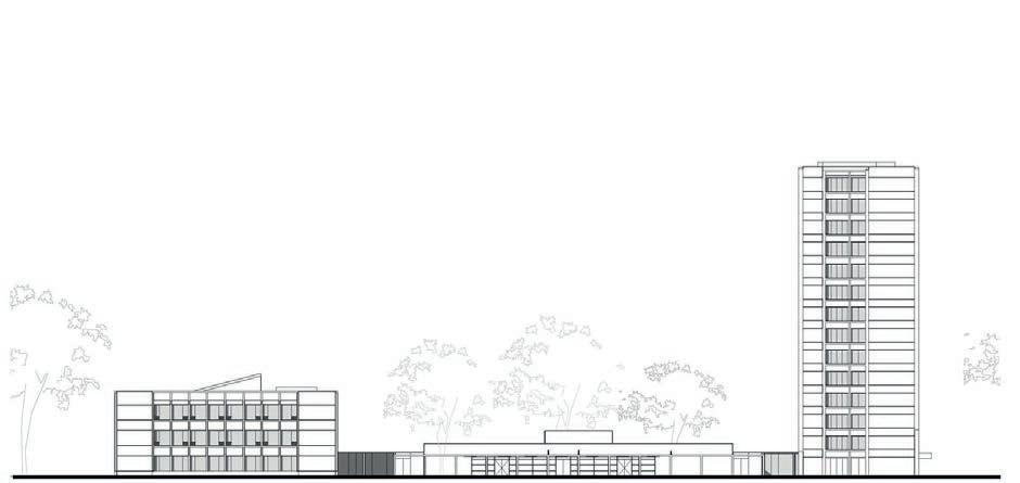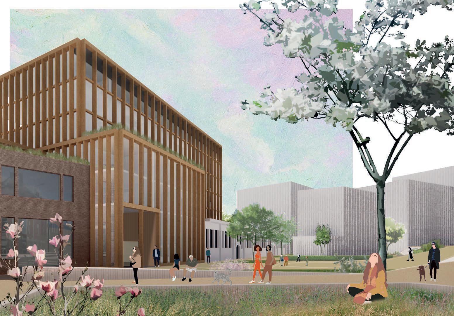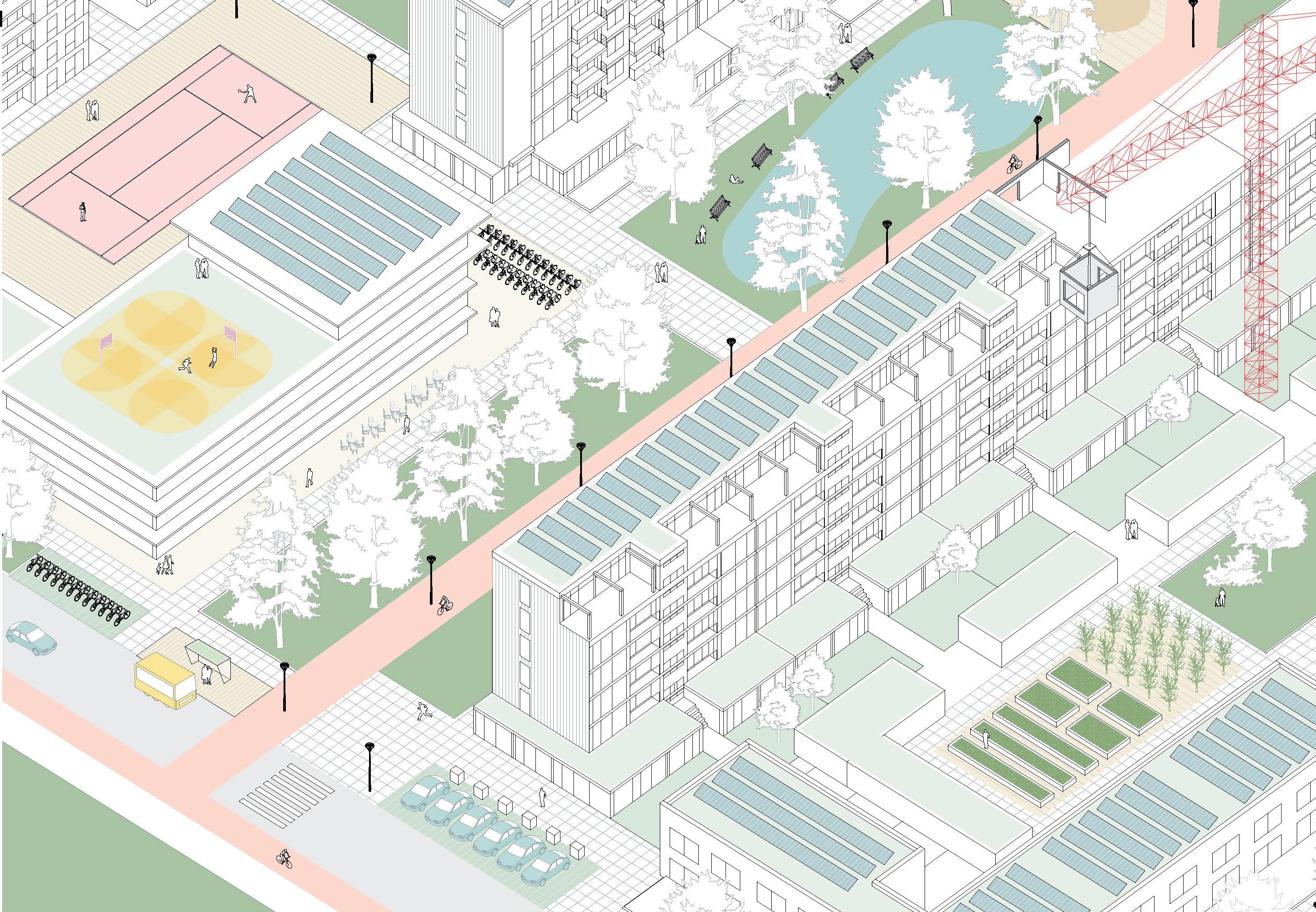 North-east facade/ Dakpark edge lively public area at the Dakpark’s edge, next to the monument in our project. Surrounded by new housing development, we create a dynamic green spot for people to gather and connect. It’s a blend of nature and living, a place where the community can come together.