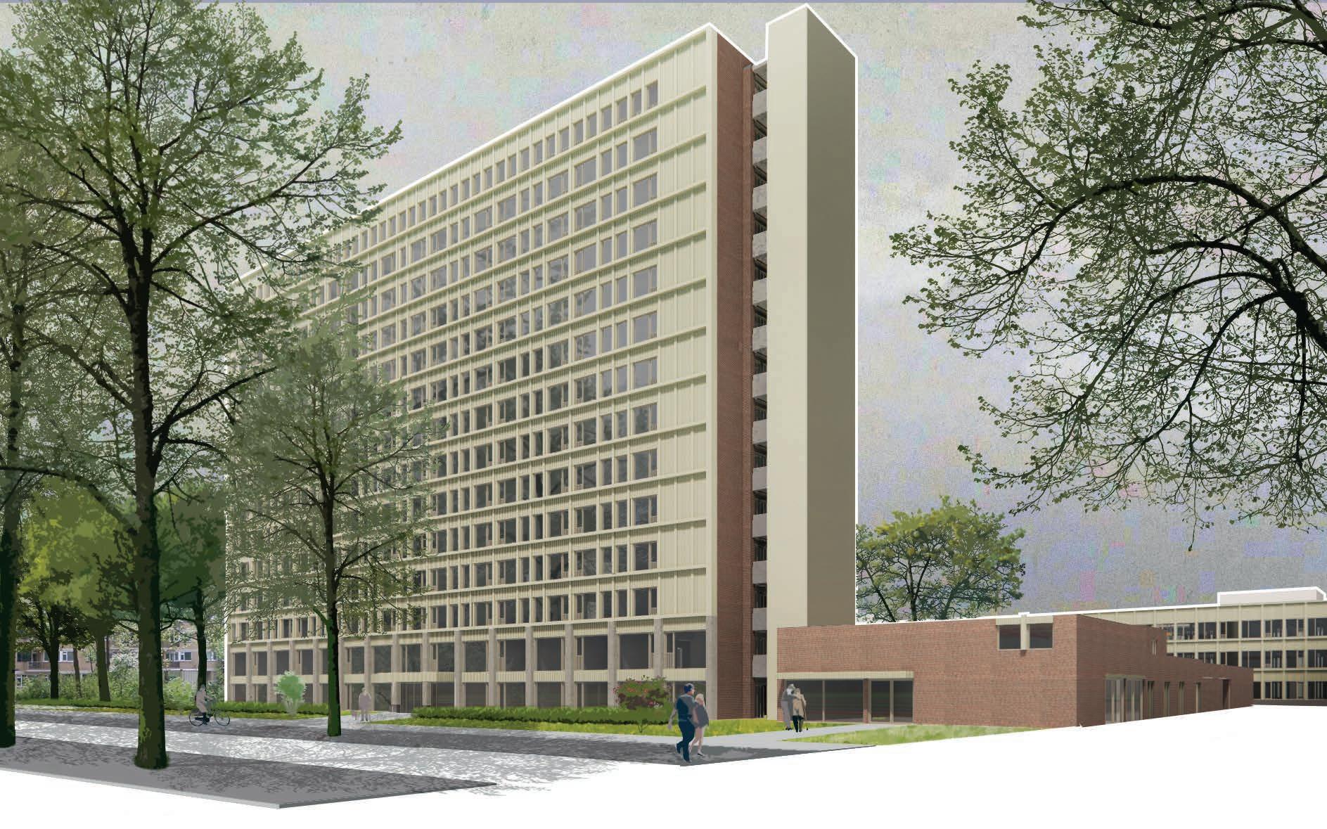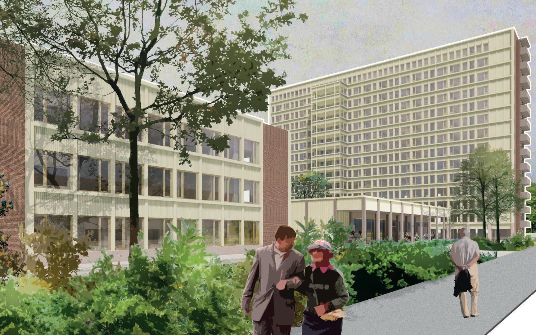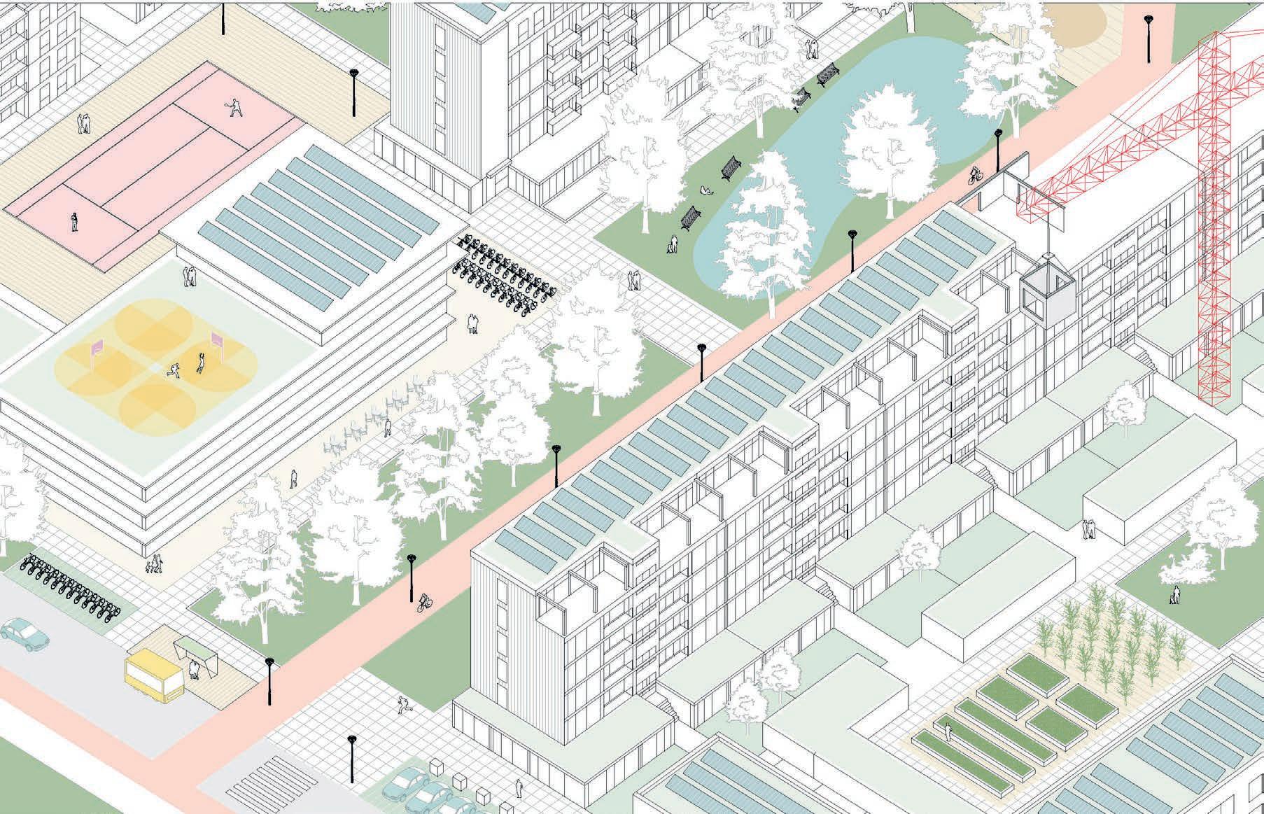 North-east facade/ Dakpark edge lively public area at the Dakpark’s edge, next to the monument in our project. Surrounded by new housing development, we create a dynamic green spot for people to gather and connect. It’s a blend of nature and living, a place where the community can come together.