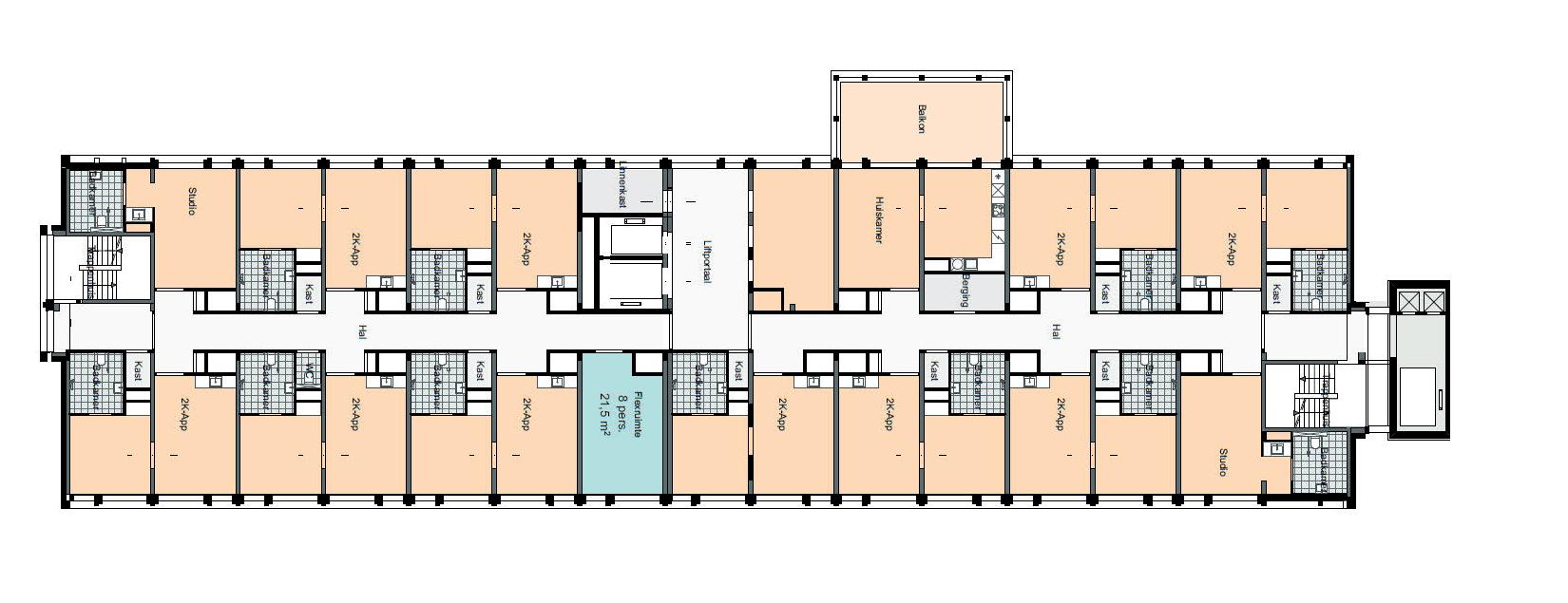New wooden structure apartments ranging from 80-110 m2 BVO. The height adheres to the limit set by the nearby windmill.