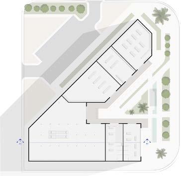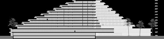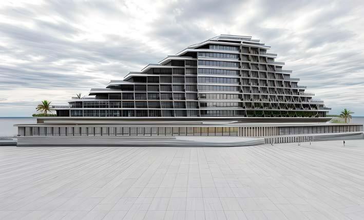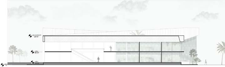 The sharp angles can also evoke a sense of urbanity and strength, fitting well with the surrounding cityscap also The sharp angles create interesting contrasts with the surrounding curved forms of palm trees and the soft lines of the cityscape. This interplay of straight and curved lines adds depth and dynamism to the design.Material Continuity: Using materials that visually transition between the exterior and interior could reinforce the sense of interconnectedness and create a more unified aesthetic