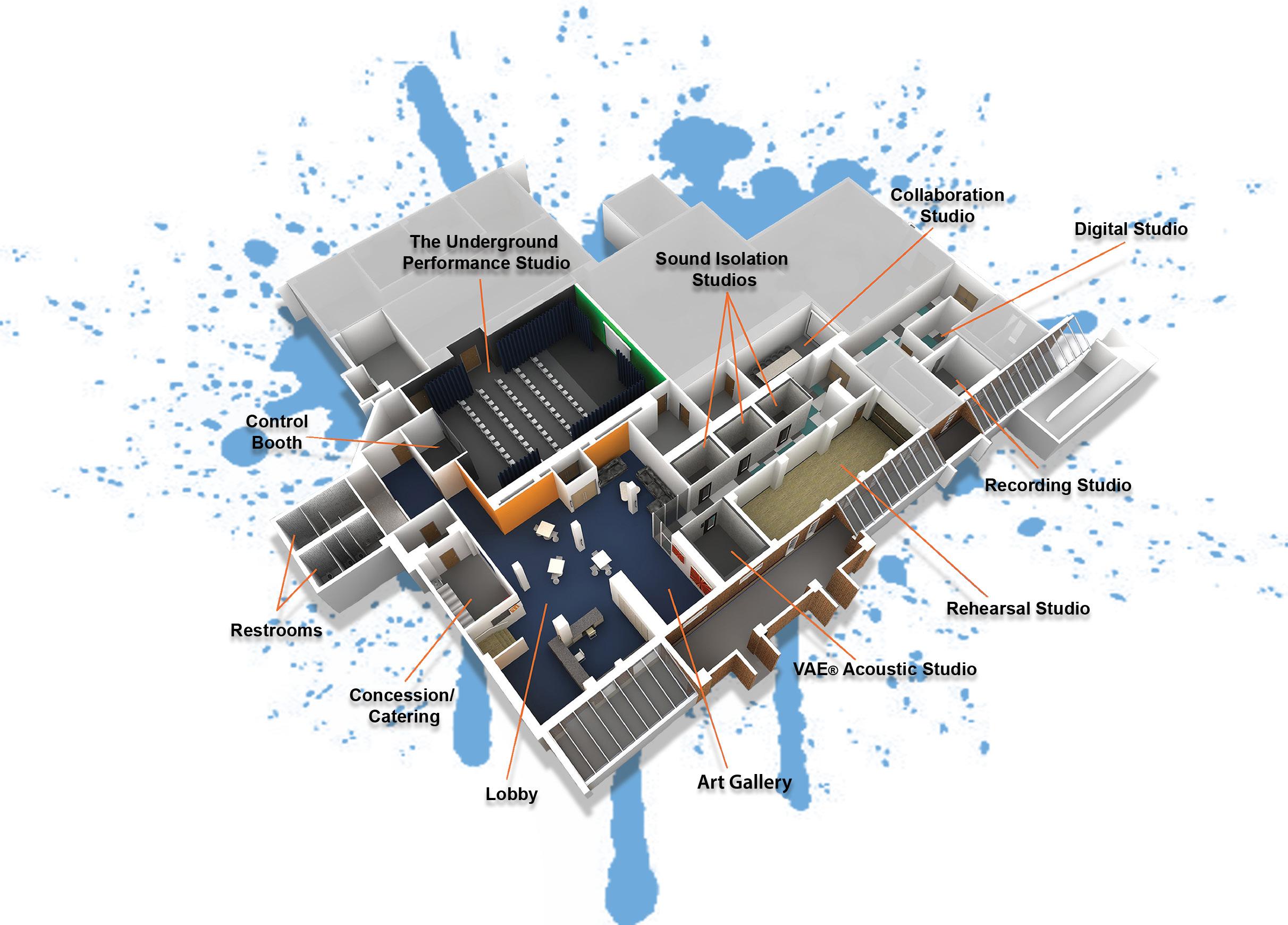 CAM Creative Community’s Music Practice Studios feature the next generation of sound isolation rooms dedicated to music-making. Using the most advanced technologies available, each of the three, self-contained rooms gives the student musician a space to develop composition and performance skills. The rooms also encourage freedom of expression and privacy to explore new ideas. With added “virtual acoustics” students can learn how to adapt to performing in different spaces ranging from a recital hall to a 10,000-seat arena and get immediate feedback with record/ playback during the practice session.